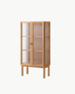 De elegante riflede glassdørene gir et sofistikert uttrykk og lar innholdet skimtes diskret gjennom glasset, noe som gjør skapet ideelt for oppbevaring av bøker, dekorative objekter eller personlige samlinger. Bak dørene finner du to høydejusterbare hyller i eikefinér, som gir fleksibel oppbevaring tilpasset dine behov.