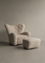 Designet ble først presentert på Copenhagen Cabinetmakers’ Guild Exhibition i 1936 og har siden blitt et ikon innen dansk design. I likhet med stolen er ottomanen trukket i eksklusivt lammeskinn, inspirert av originalversjonen, og er utviklet med fokus på både håndverk og komfort.