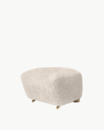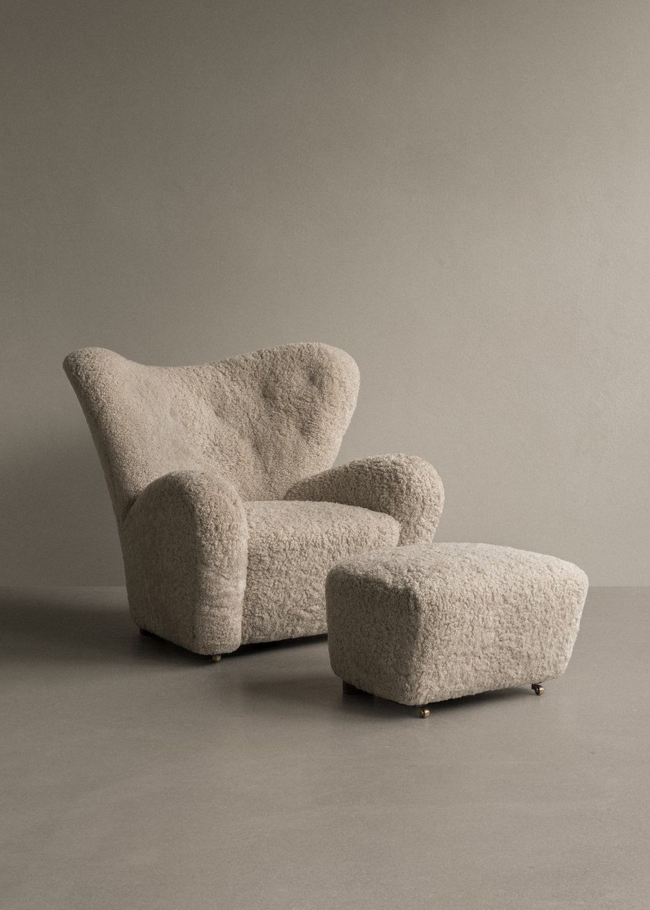 The Tired Man Ottoman er polstret i Oeko-Tex®-sertifisert lammeskinn fra Skandilock, noe som gir en myk, varm og naturlig overflate. Sammen med stolen fullfører den det karakteristiske uttrykket og gjør sitteopplevelsen enda mer komfortabel.