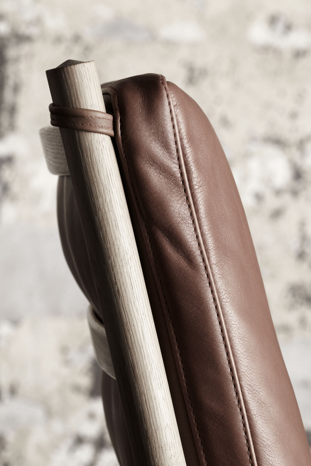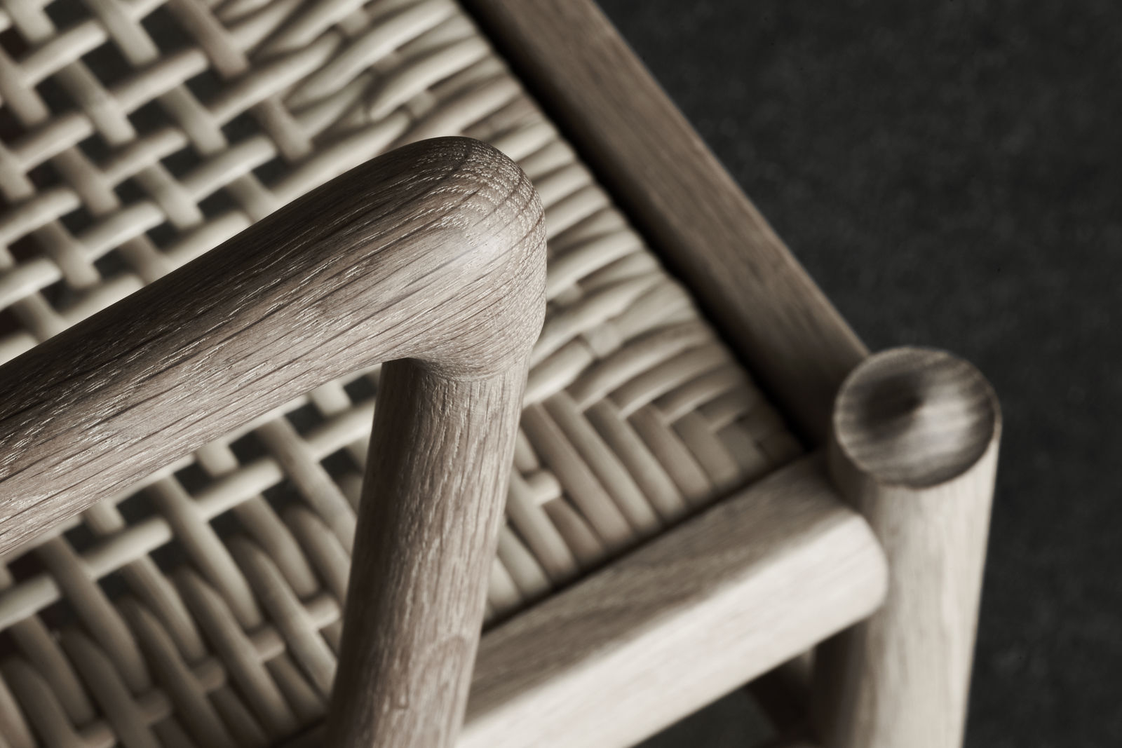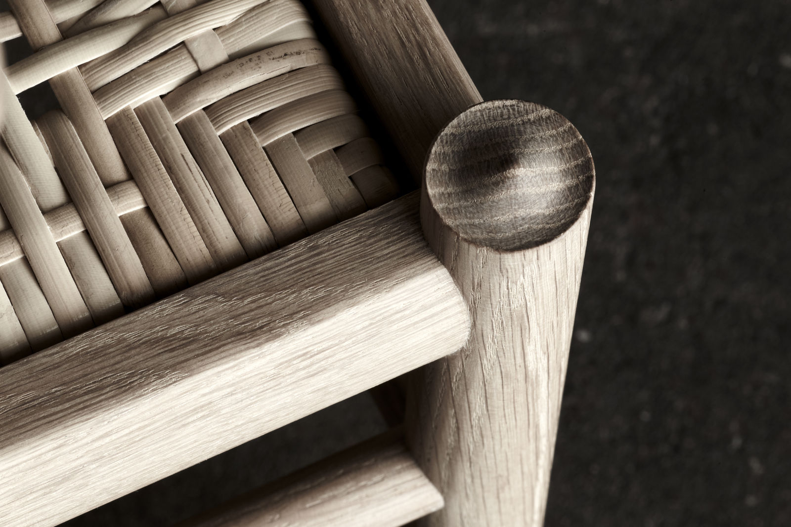 *På eik er trestrukturen synlig under malingen. Setet er utformet i håndvevet rørfletning.