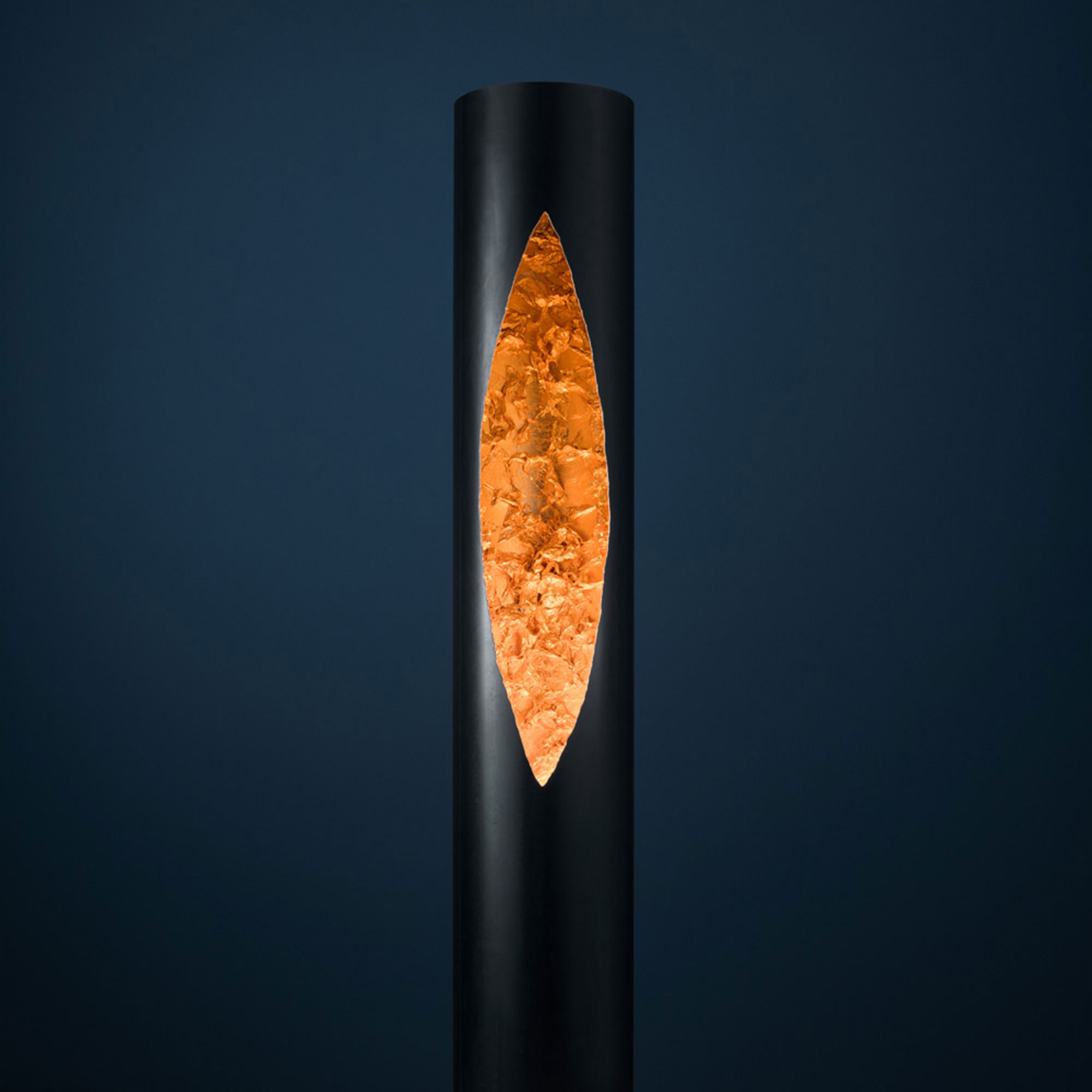 Gulvlampen Colonna er en del av Luci d’Oro-kolleksjonen fra Catellani & Smith, som ble presentert i 2000 i Tribeca, New York. Kolleksjonen er skapt av Enzo Catellani med inspirasjon fra solen og ildens varme og fargeskala. Colonna består av et høyt rør i vokset svart smijern med en utskåret front som avslører den vakre glitrende innsiden. Catellani har kledd innsiden av lampen med løvtynne blader av gull, kobber og sølv, noe som gjenspeiler en stemningsfull glød i rommet. Colonna kommer med en integrert dimmer. Eksklusivt produsert for hånd i Italia, like ved elven Serio i traktene rundt Bergamo.