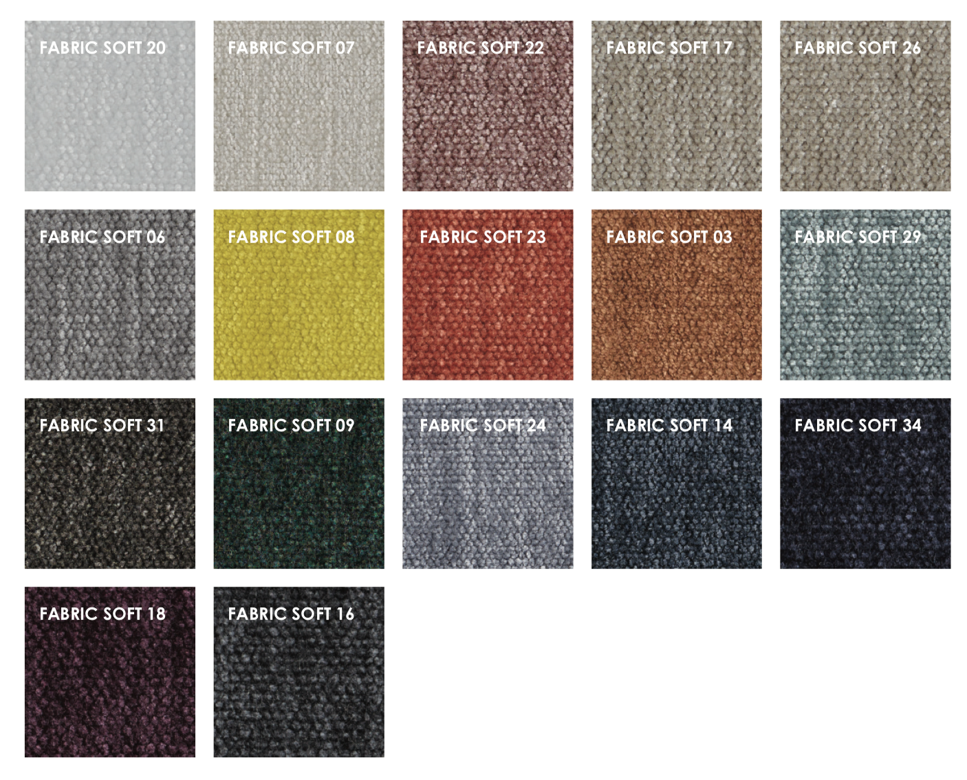 Stoff: SOFT Fargefasthet til lys = 5 *** – EN ISO 105-B02 Fargefasthet til gnidning våt = 3-4 *** – EN ISO 105-X12 Fargestyrke til å tørke = 4-5 **** – EN ISO 105-X12 Pilling: 4-5 **** – ISO 12945- 2 Sammensetning: 45% viskose, 35% bomull, 20% polyester Slitasje: 27.000 *** – EN ISO 12947-2 Eilersens Klassifisering for polstring som skal brukes i privat hjem: * dårlig ** forsiktighet *** akseptabelt **** bra ***** veldig bra Stoffet endrer utseendet avhengig av vinkelen som den blir sett på. Forandringen kan variere fra en mattere og mørkere overflate til en skinnere og lettere farget. Endringen er også merkbar i de områdene hvor stoffet er utsatt for slitasje. Denne forandringen er typisk for velourstoffer og er en forventet og inneboende egenskap ved dette materialet.
