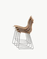 Stolen leveres i lakkert, formpresset eik eller valnøtt, alternativt med heldekkende farget finer eller lyse kanter for et moderne uttrykk. Understellet kommer i satengforkrommet eller sortlakkert stål, med karakteristiske bolter som gir et grafisk preg.
