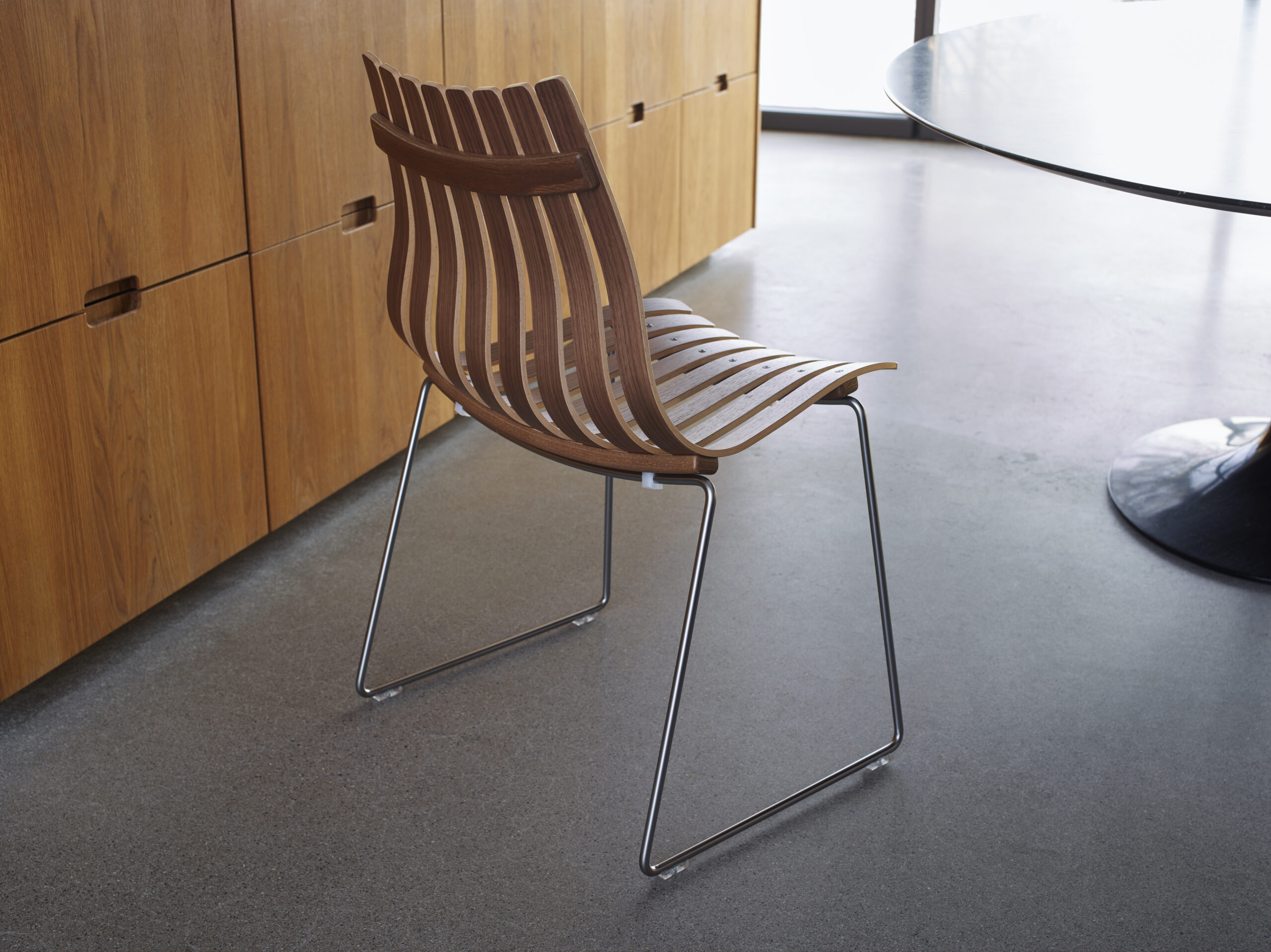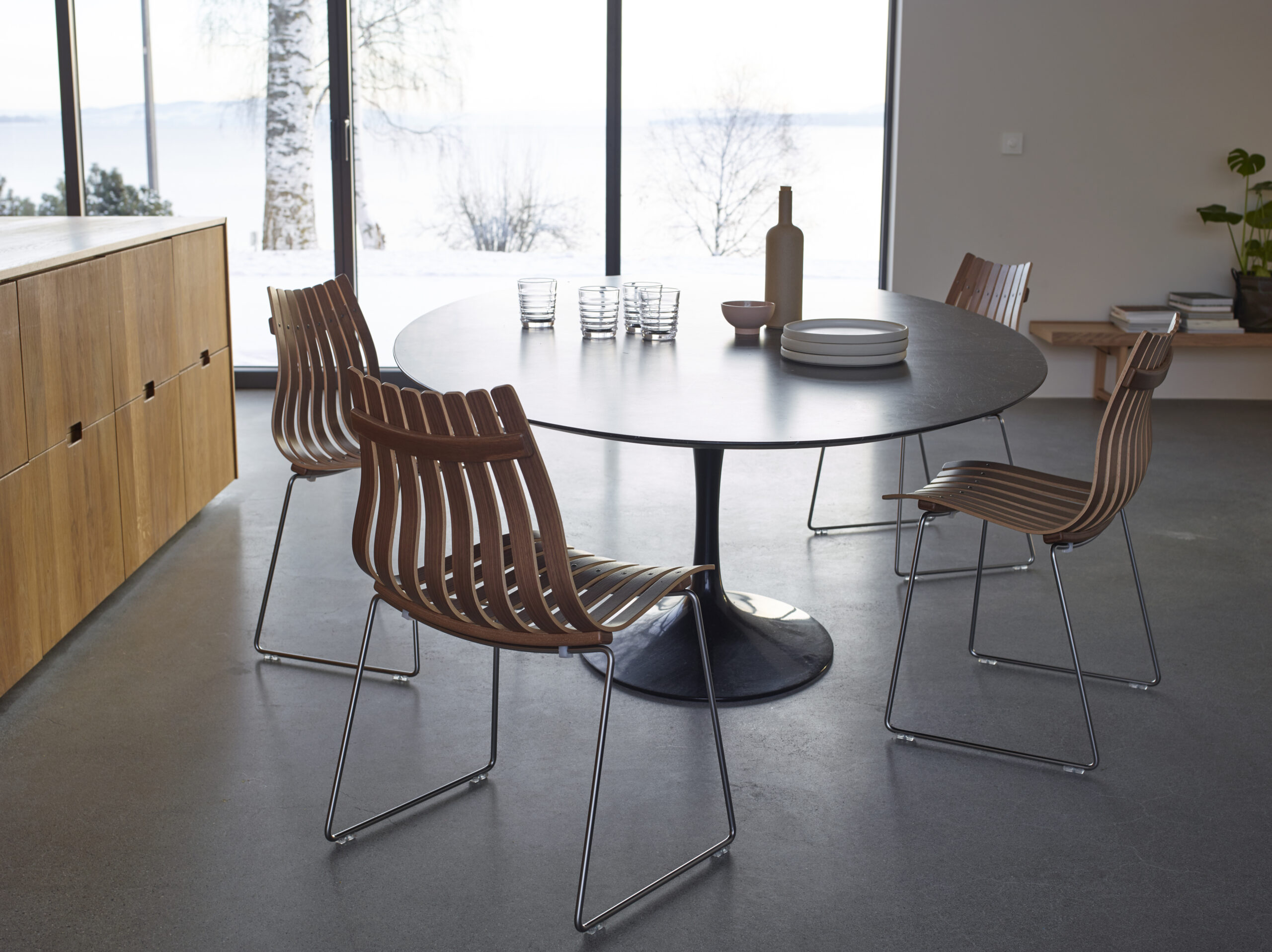 Scandia Junior er en ikonisk spisestol designet av Hans Brattrud – et sentralt verk i norsk og skandinavisk designhistorie. Med sitt skulpturelle formspråk og slanke silhuett kombinerer stolen estetisk letthet med førsteklasses håndverk.