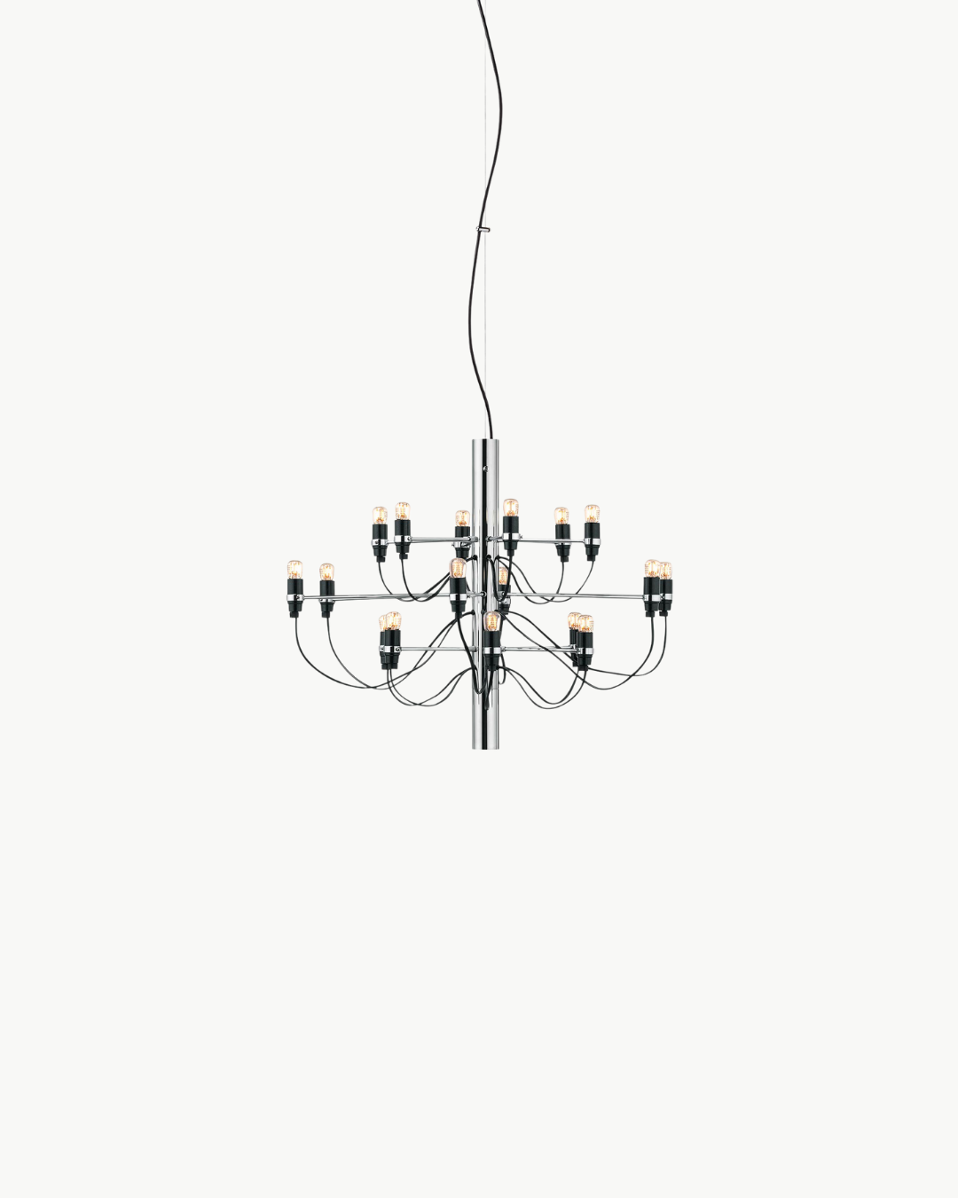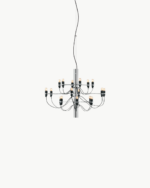 Med sine 18 lyspunkter gjør Flos 2097/18 et kraftfullt visuelt inntrykk og egner seg spesielt godt i rom med god takhøyde, som over spisebord, i trapperom, stuer eller representative offentlige miljøer. Lampen leveres med takfeste og rosett i stål for et helhetlig og gjennomført uttrykk.