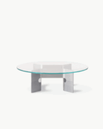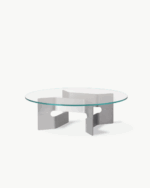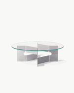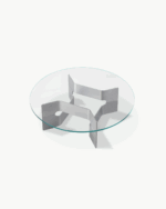 Bordets skulpturelle base er laget i børstet, resirkulert aluminium og kombinert med en bordplate i herdet glass – materialvalg som understreker både funksjonalitet og estetisk finesse. JG Coffee Table er produsert i Danmark med fokus på kvalitet og bærekraft.