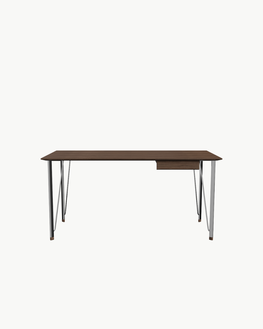 Den relanserte versjonen leveres i to utførelser: valnøttfinér eller sortbeiset ask, med understell i enten forkrommet stål eller sort pulverlakkert stål. Som tilvalg kan bordet utstyres med en dokument-skuff i massivt tre, nøye tilpasset bordplatens materialer – for en helhetlig og personlig løsning.