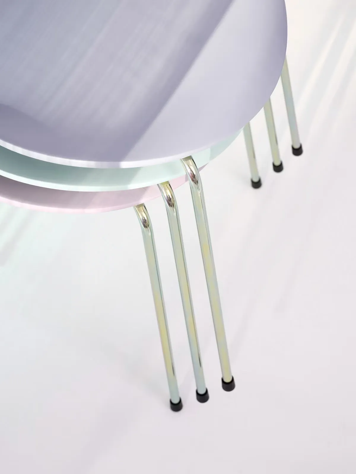 Vi har 6 stk. – én i hver farge med polerte stålben, samt én rosa variant med Rainbow-understell.