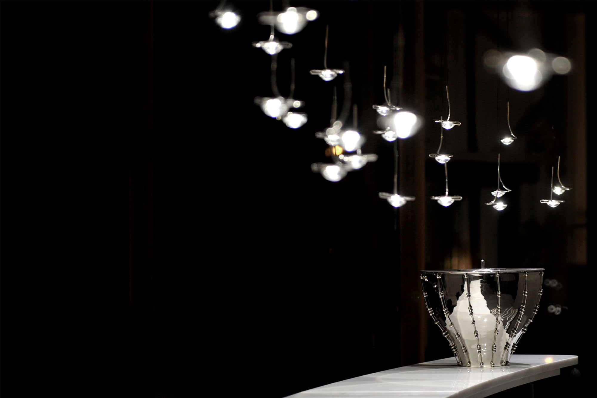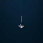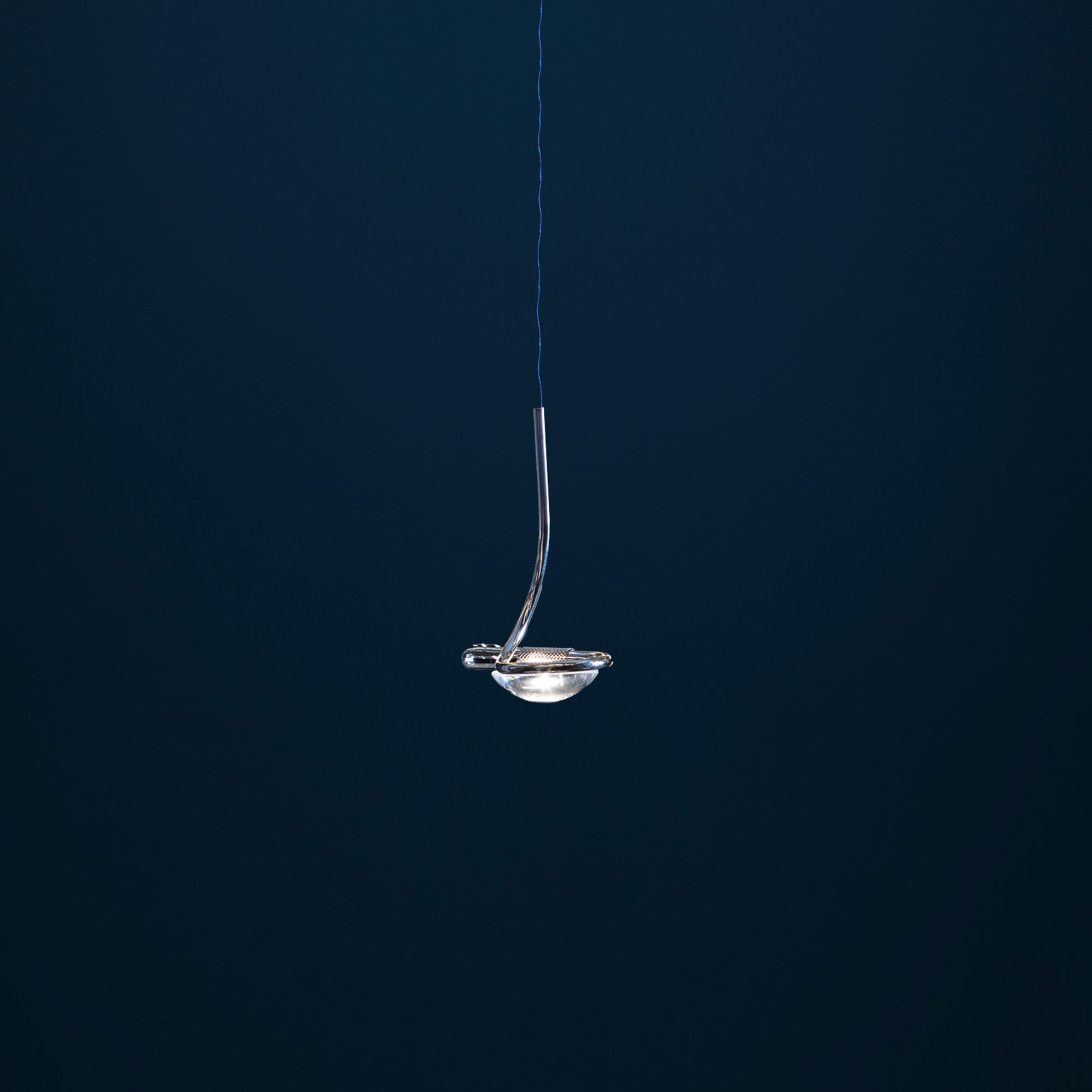 Lampen er laget av en enkel glasslinse som skjuler LED-lyskilden og er innrammet av et anheng i skinnende, forniklet kobber. Glasslinsene kan byttes ut om nødvendig. Den ultratynne blå ledningen blir en elegant, subtil detalj. Lyset kan også dimmes. Jackie O fås både som pendellampe og større lysekrone med flere pærer. Eksklusivt produsert for hånd i Italia, like ved elven Serio i traktene rundt Bergamo.