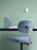 Sete og rygg er laget av formpresset finér, trukket i slitesterkt stoff – her med tekstilet MN01 fra Mads Nørgaard-kolleksjonen, som gir stolen et moderne uttrykk med et hint av mote og personlighet.