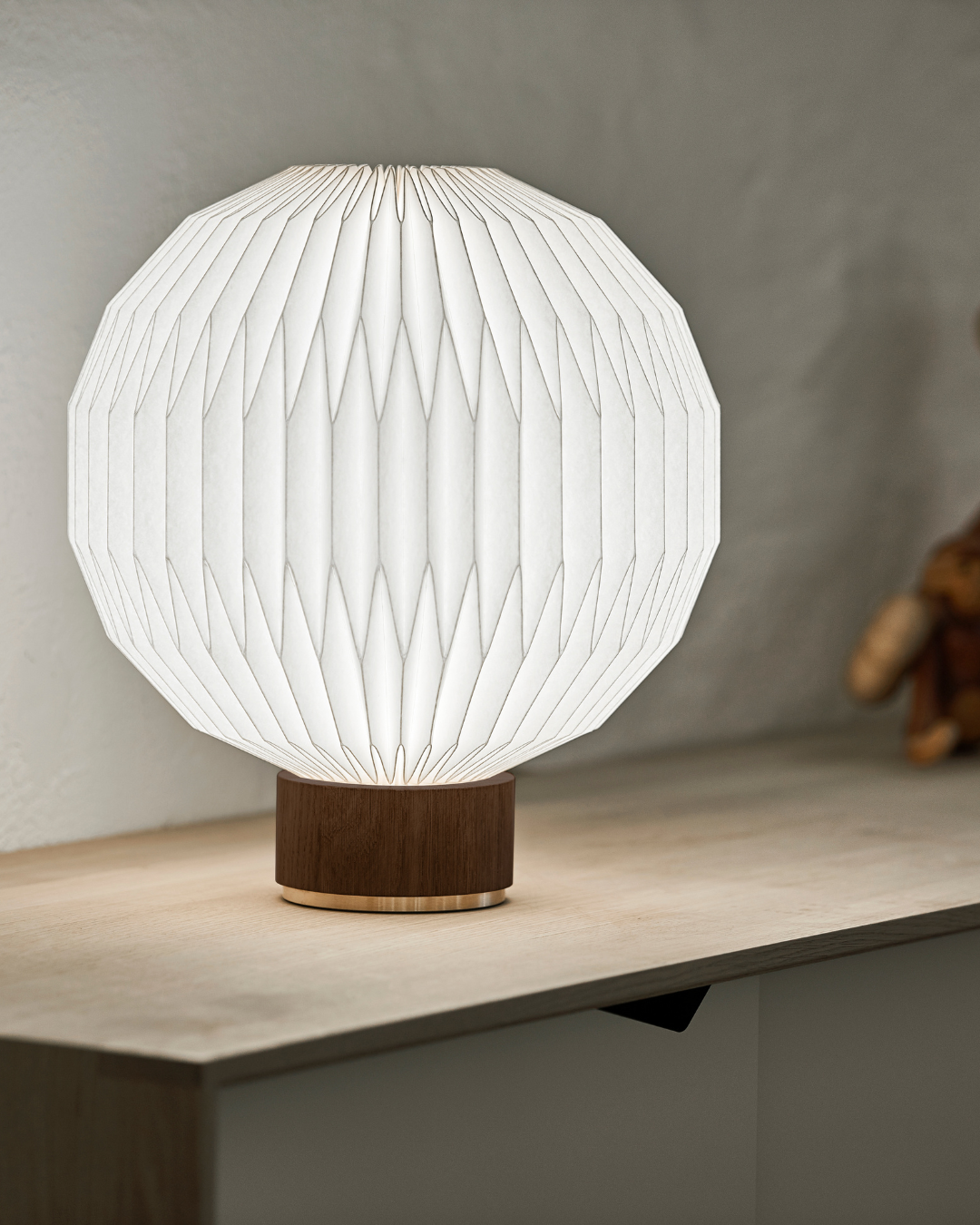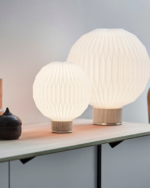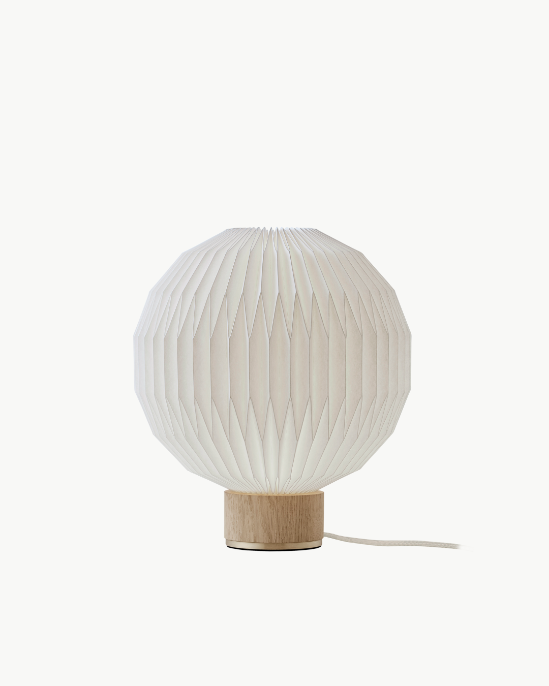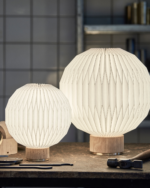 Lampeskjermen, identisk med den som pryder Model 107, er nøye håndfoldet for å sikre høy kvalitet og harmonerer perfekt med den elegante basen med detaljer i messing, som fullfører lampens design. Fargevariantene – lys eik med sandfarget tekstilledning og røkt eik med svart tekstilledning – skaper et vakkert visuelt kontrast som passer like godt i moderne som klassiske interiører.