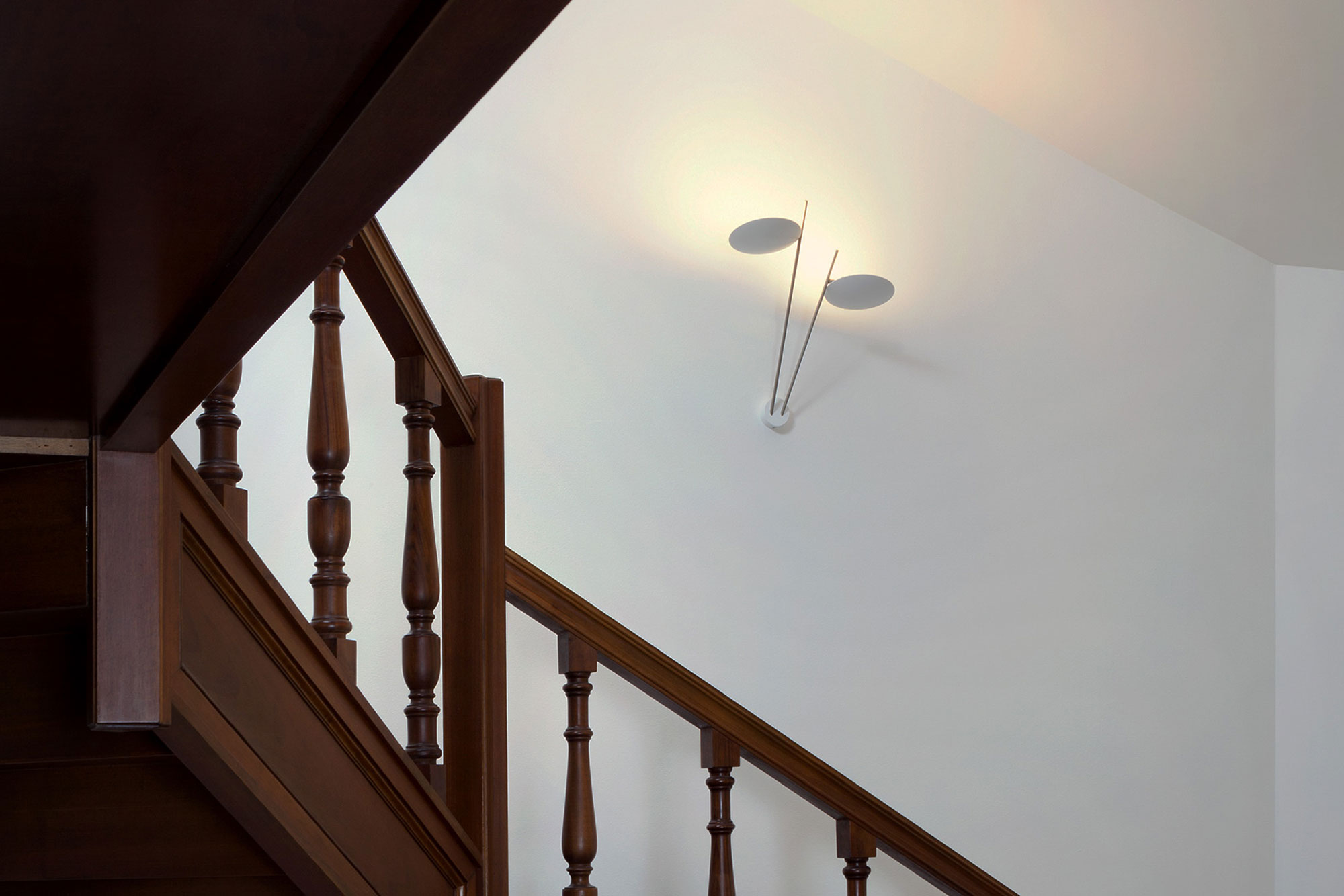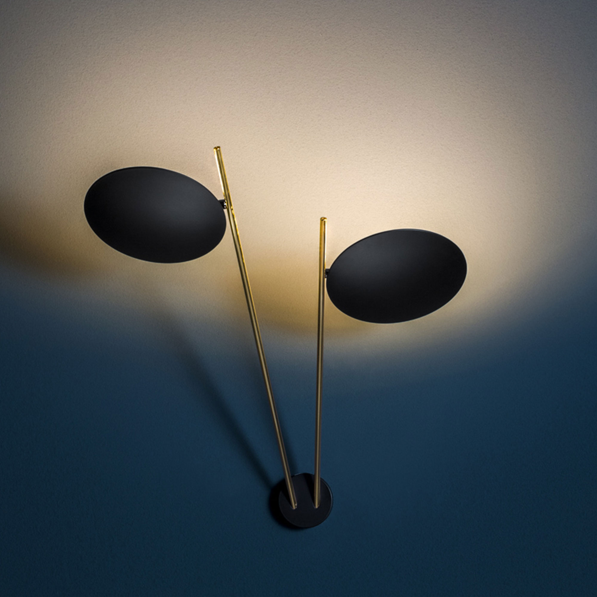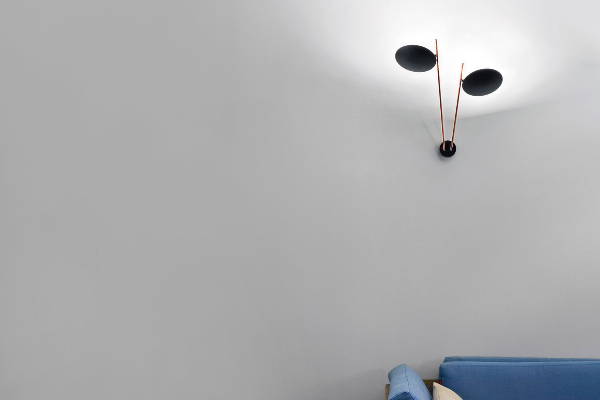 Vegglampen W2 er del av kolleksjonen Lederam fra Catellani & Smith, designet av Enzo Catellani. Designet er nedstrippet, men likevel dekorativt og består hovedsakelig av to komponenter en enkel metallarmatur og en sirkulær plate i aluminium. Lyset reflekteres mot platen, noe som gir en myk, indirekte lysspredning i rommet. Lyskildene består av integrerte LED-pærer som kan dimmes. Lederam W2 er modellen av taklampen med to armaturer. Den finnes i flere ulike fargekombinasjoner av pulverlakkert metall i svart eller hvitt som kontrast med bladgull, kobber eller sølv. Akkurat som all annen belysning fra Catellani & Smith, er også denne kolleksjonen produsert for hånd i Italia ved elven Serio like utenfor Bergamo.