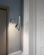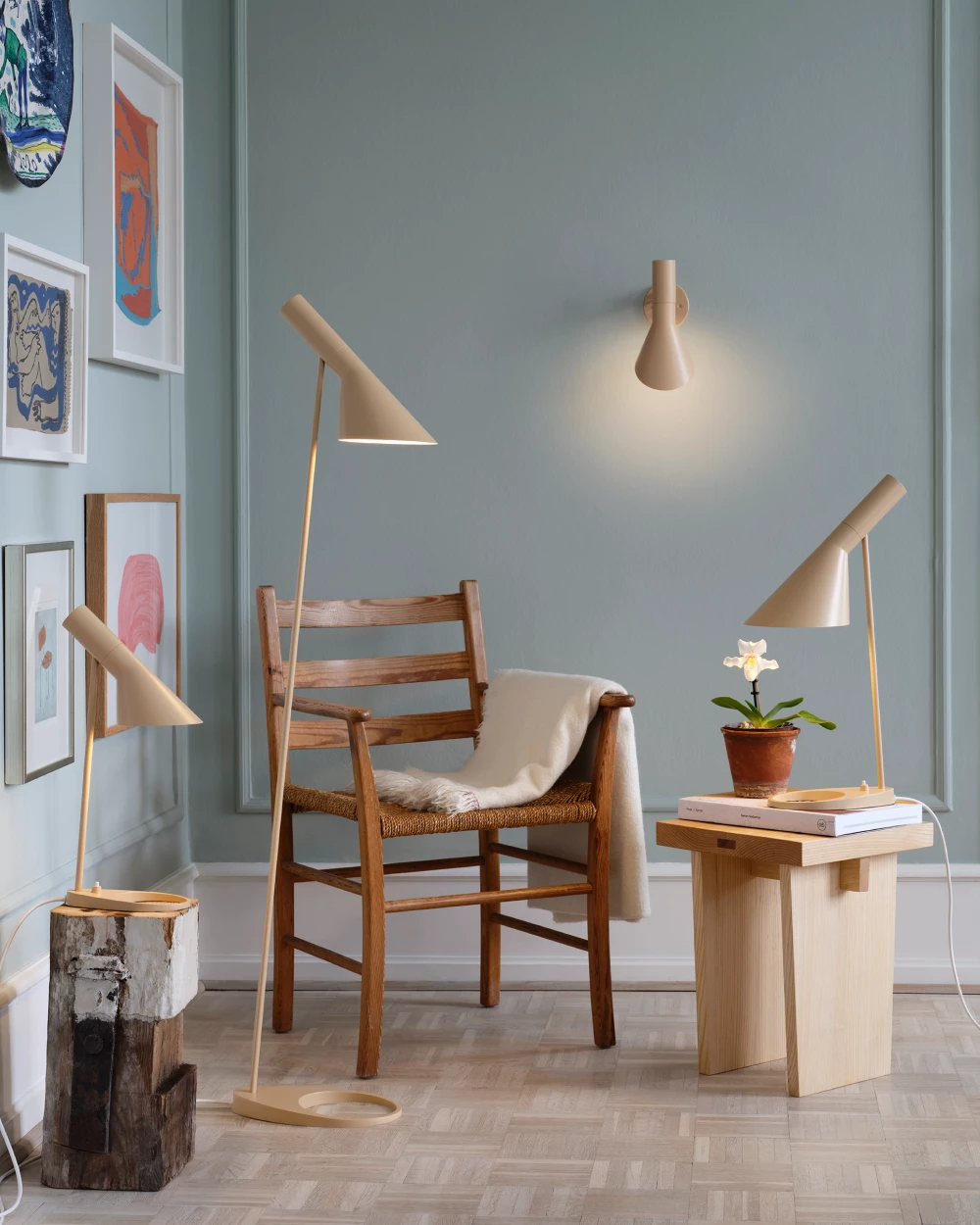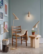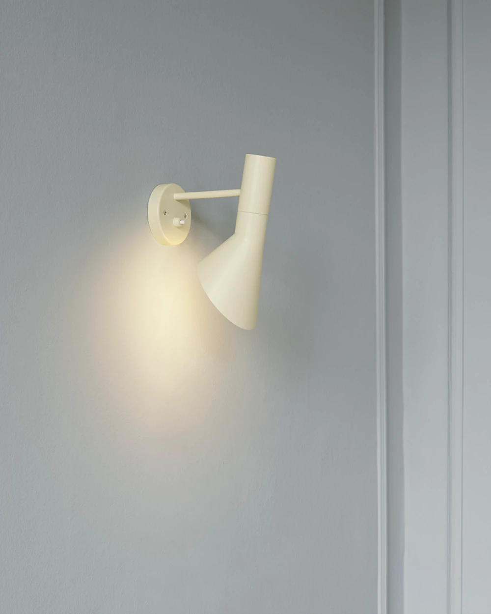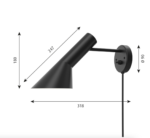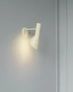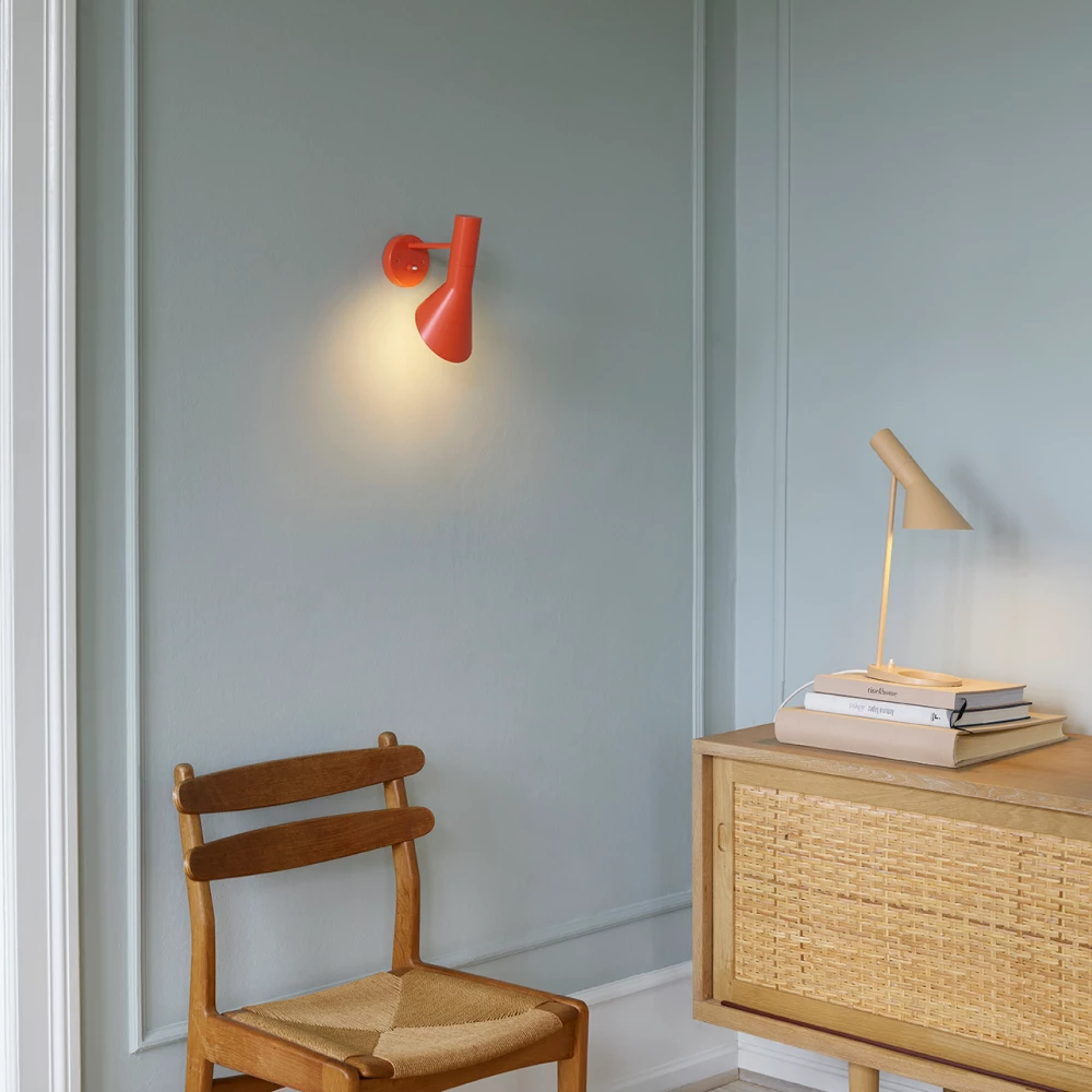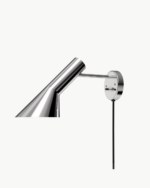AJ-serien, som også inkluderer bordlamper, gulvlamper og bordmonterte lamper, kjennetegnes av rene linjer, geometriske former og harmonien mellom rette og kurvede elementer – typisk for Jacobsen. Med materialer som kobber og rustfritt stål var lampene med på å definere interiøret i SAS Royal Hotel, og AJ Vegglampe fremstår i dag som en tidløs designklassiker for både private og offentlige rom.