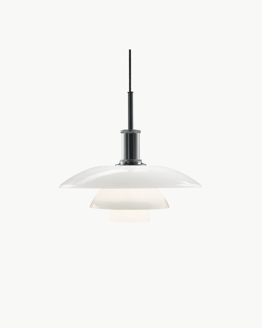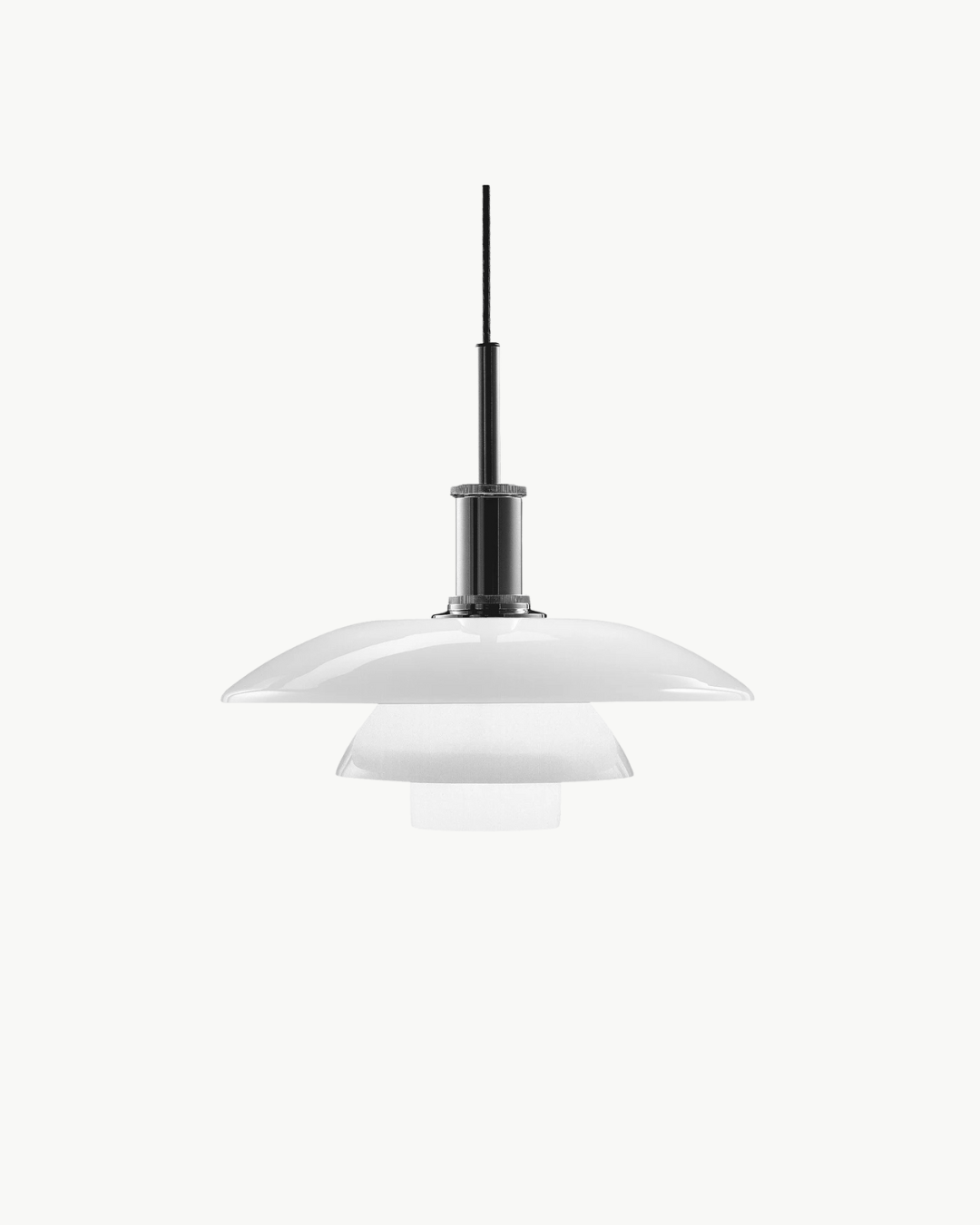 Med sine munnblåste opalglasskjermer sprer pendelen et mykt og jevnt lys, perfekt for å skape en varm atmosfære over spisebordet, i stuen eller som et elegant blikkfang i større rom. De tre skjermene er nøye utformet for å reflektere lyset nedover og samtidig gi en subtil glød ut i rommet.