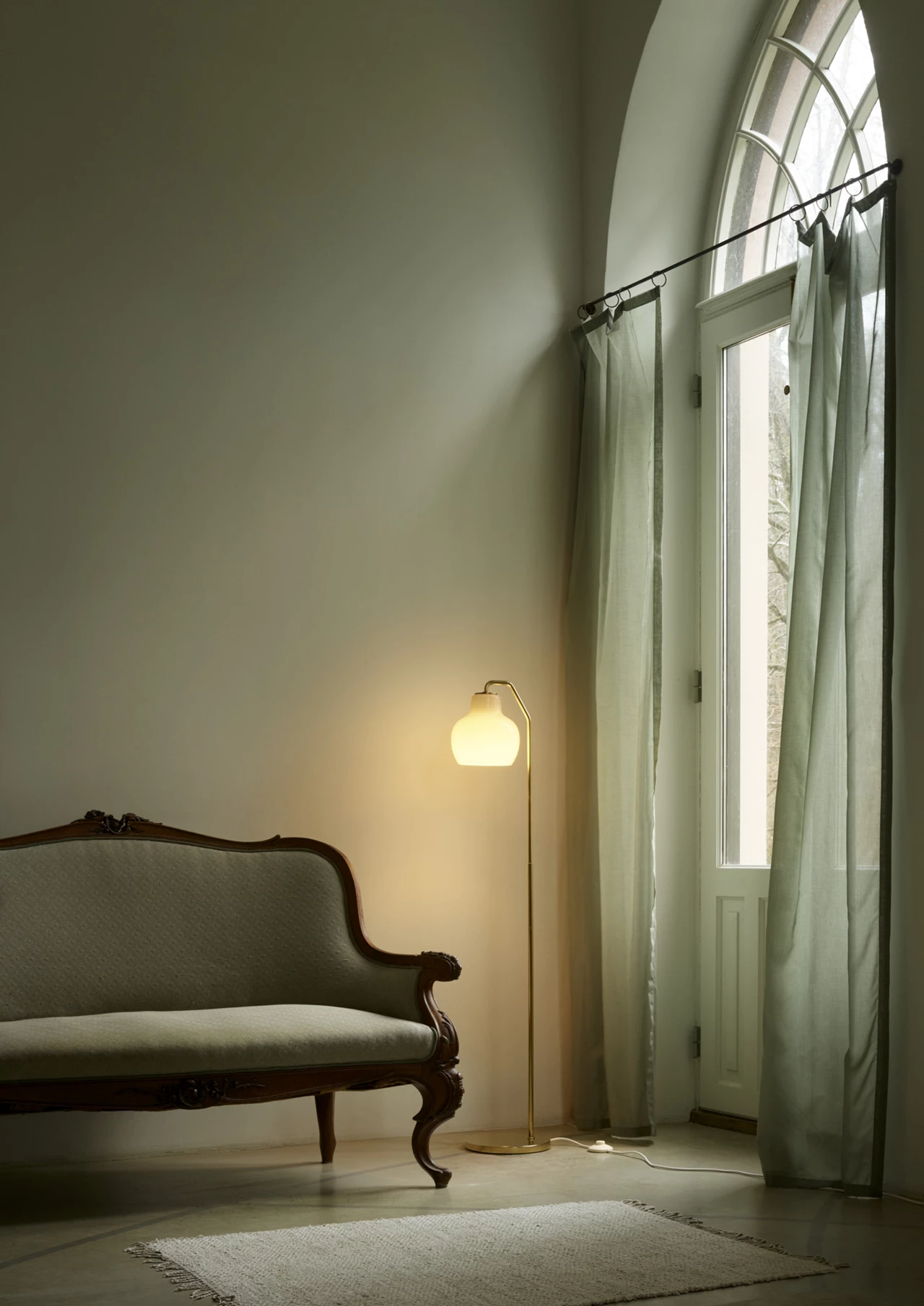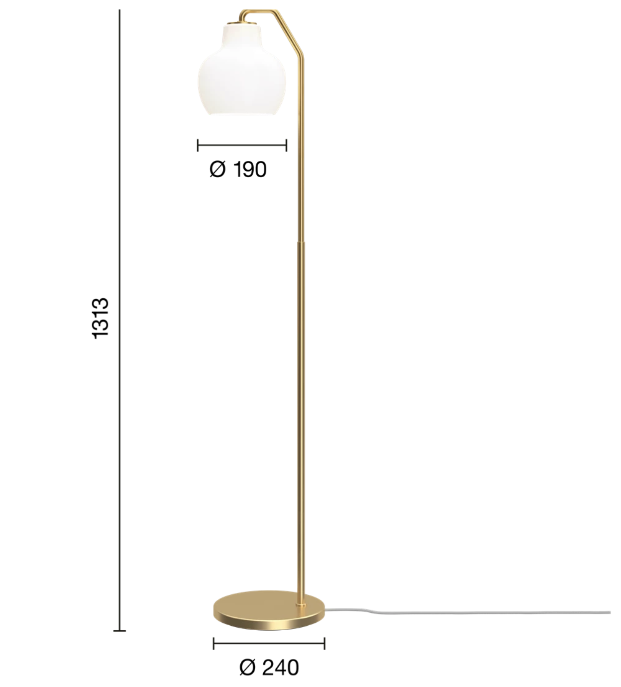 VL Ring Crown gulvlampe gir direkte nedadrettet lys gjennom åpningen nederst på den blanke, munnblåste glasskjermen. Det trelags opalhvite glasset gir myk, diffus og jevn belysning som omgir lampen, noe som sikrer behagelig, blendefritt lys og en innbydende atmosfære. |