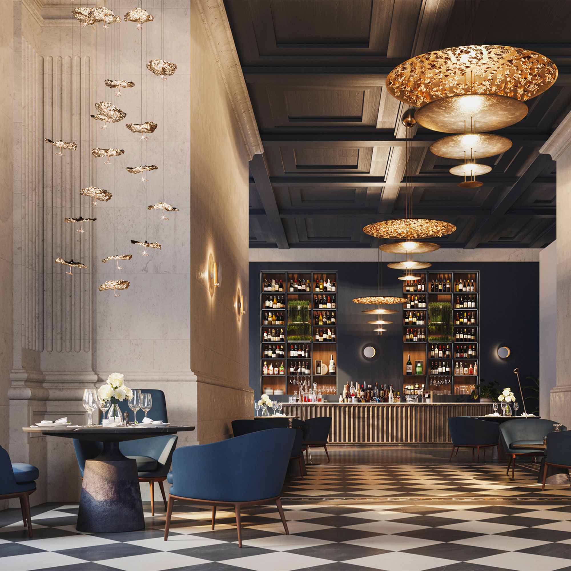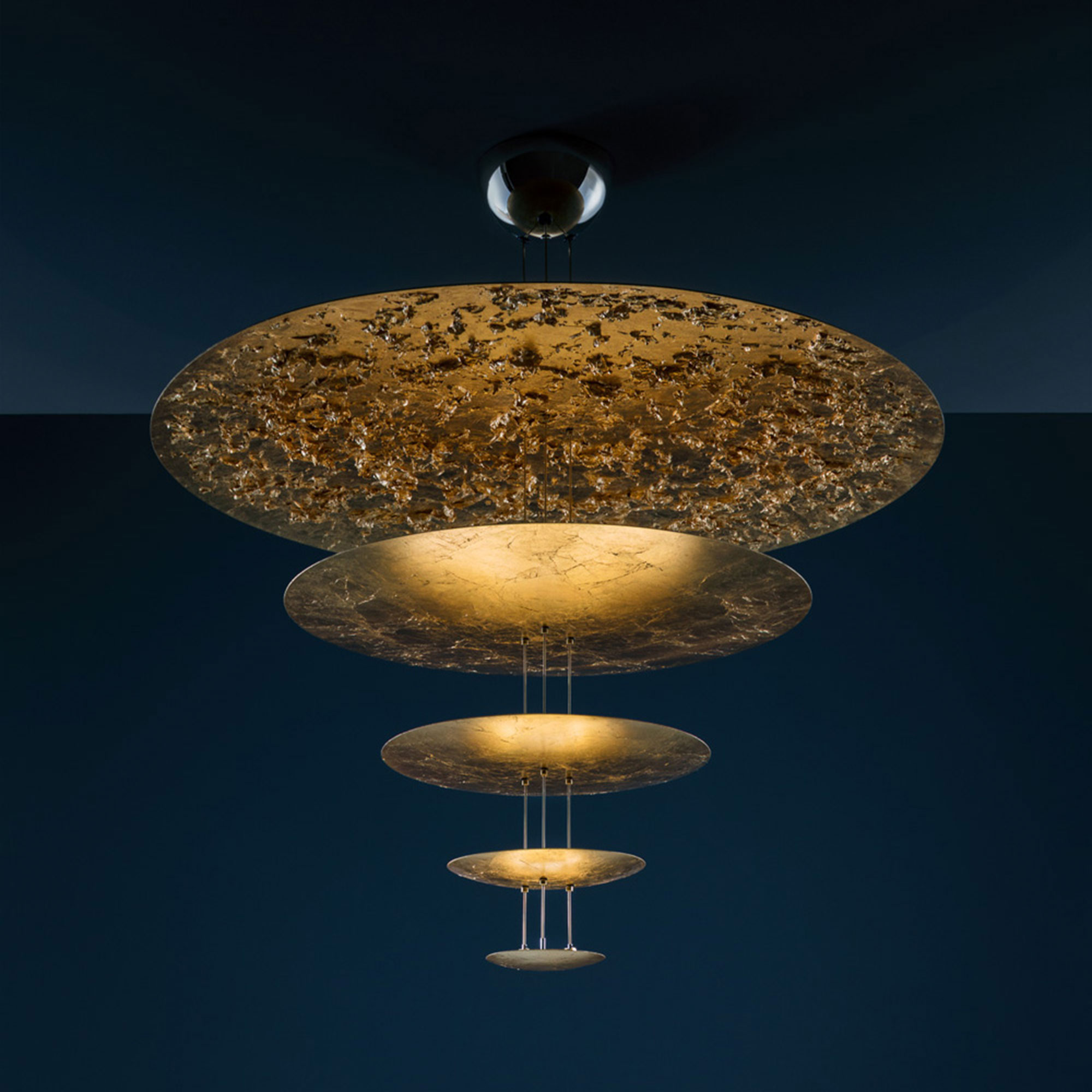 Macchina della Luce er en taklampe fra Catellani & Smith som er en videreutvikling av Luci d’Oro-kolleksjonen. Kolleksjonen er skapt av Enzo Catellani med inspirasjon fra solen og ildens varme og fargeskala. Macchina della Luce Mod. A består av fire sirkulære skiver i aluminium, som er dekket med løvtynne blader av gull eller sølv, der den største platen er pyntet med svevende blader. Lampen kommer med matchende messing eller forniklet konstruksjon. Lyskildene som er plassert på toppen av de tre nedre skivene sprer et mykt og indirekte lys i rommet. Avstanden mellom skivene kan justeres mellom 15 og 30 cm for å skape det ønskede uttrykket på lampen, hvis sjarm ligger i å aldri være den samme. Eksklusivt produsert for hånd i Italia, like ved elven Serio i traktene rundt Bergamo.