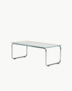 Bordets ben er forkrommet stål, som gir et moderne, industrielt preg, samtidig som det balanserer letthet og stabilitet. Den 12 mm tykke bordplaten i herdet glass gir et sofistikert uttrykk, samtidig som den er slitesterk og praktisk. Den transparente glassplaten gjør at bordets geometriske linjer og proporsjoner kommer til sin rett, og skaper en luftig og åpen følelse i rommet.