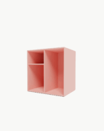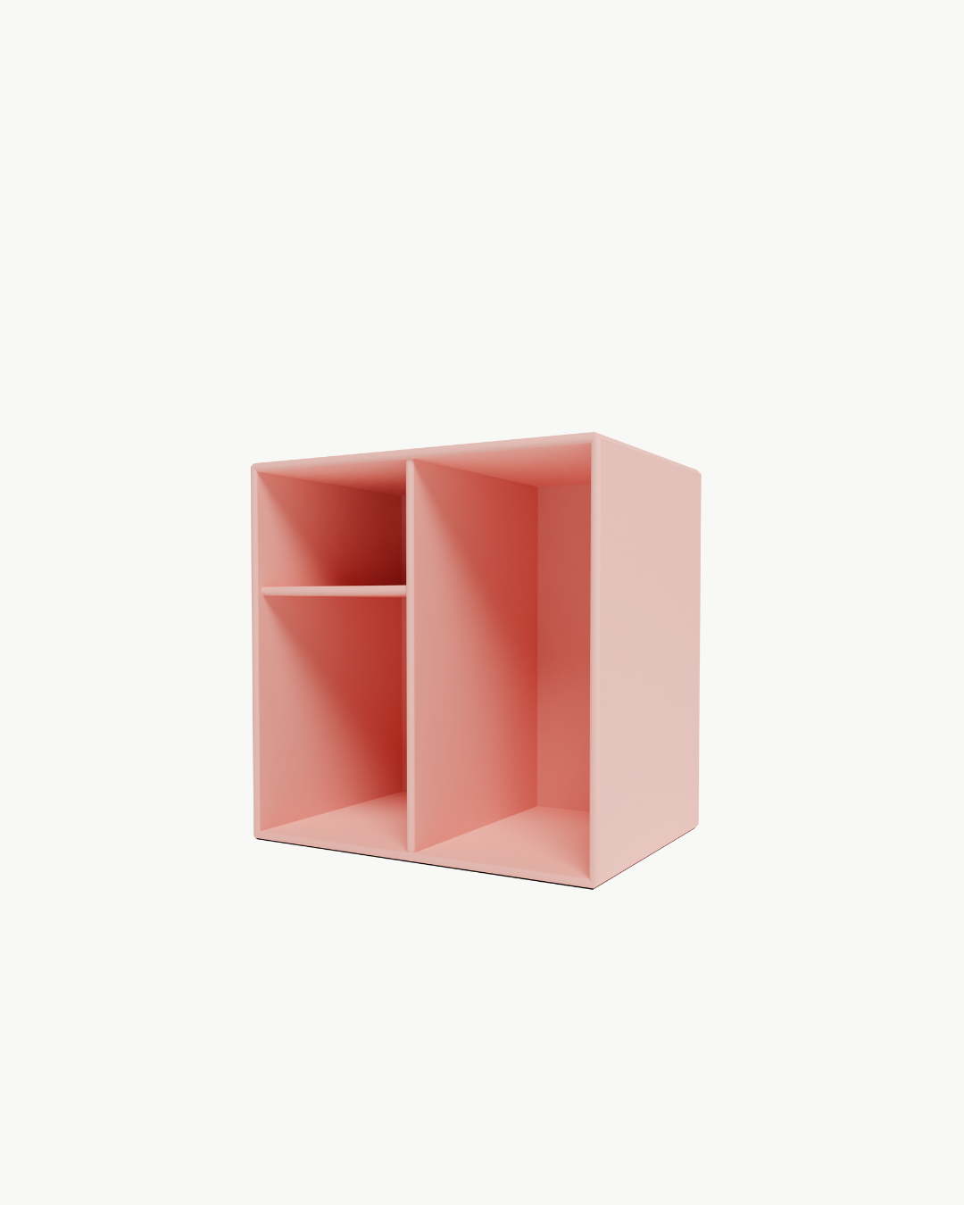 Denne Montana Mini‑modulen har tre asymmetriske rom. I denne varianten er det største rommet plassert til høyre, men modulen kan enkelt vendes takket være den fleksible monteringen. Montana Mini er tilgjengelig i 10 forskjellige vannbaserte lakkfarger.