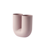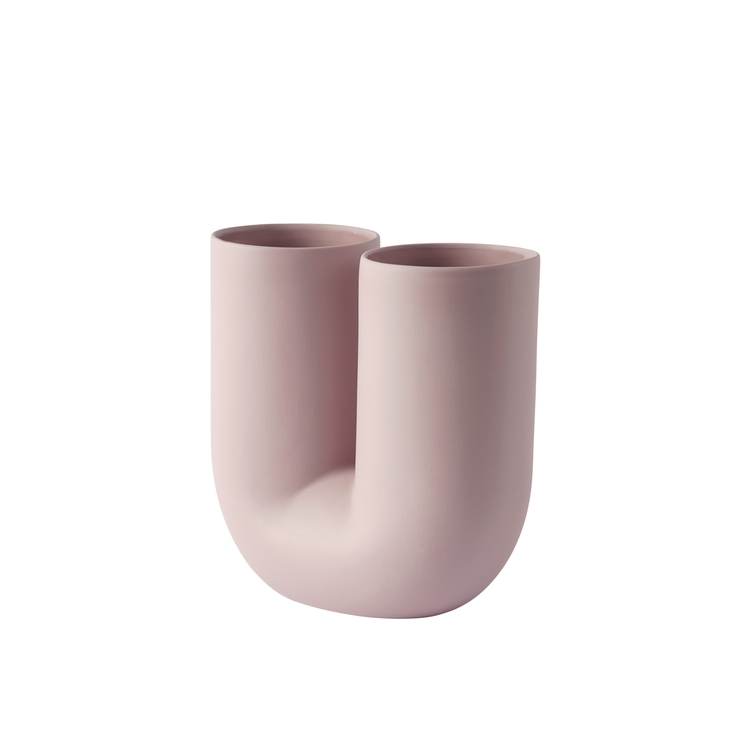 Kink Vasen bringer en moderne form til den arketypiske blomstervasen gjennom en kombinasjon av tradisjonelt håndverk og lekent designspråk. Med sin doble åpning tilfører Kink Vasen rommet en skulpturell følelse, selv når den ikke er i bruk. Designet er laget i porselen som er glassert på innsiden for en raffinert berøring.