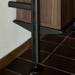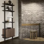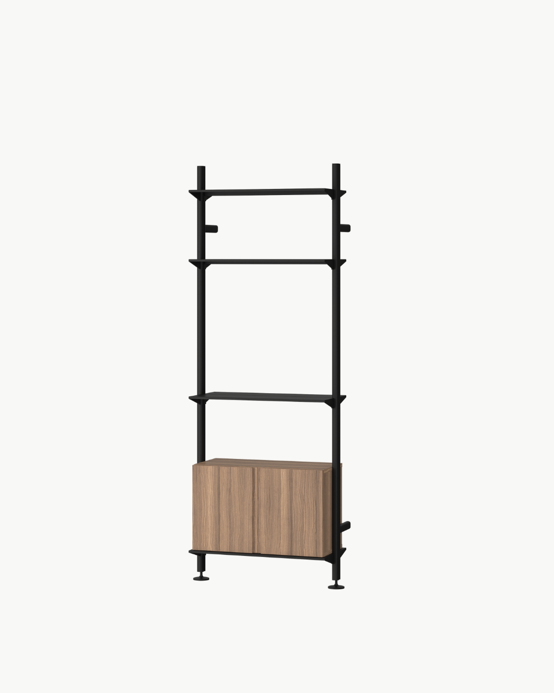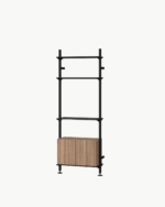 Hyllesystemet kombinerer massiv eik/valnøtt, lakkerte stålhyller og ekstruderte aluminiumsstolper i en harmonisk balanse mellom naturmateriale og metall. Resultatet er et uttrykk som både er robust, tidløst og elegant, samtidig som treverket gir et varmt og innbydende preg.