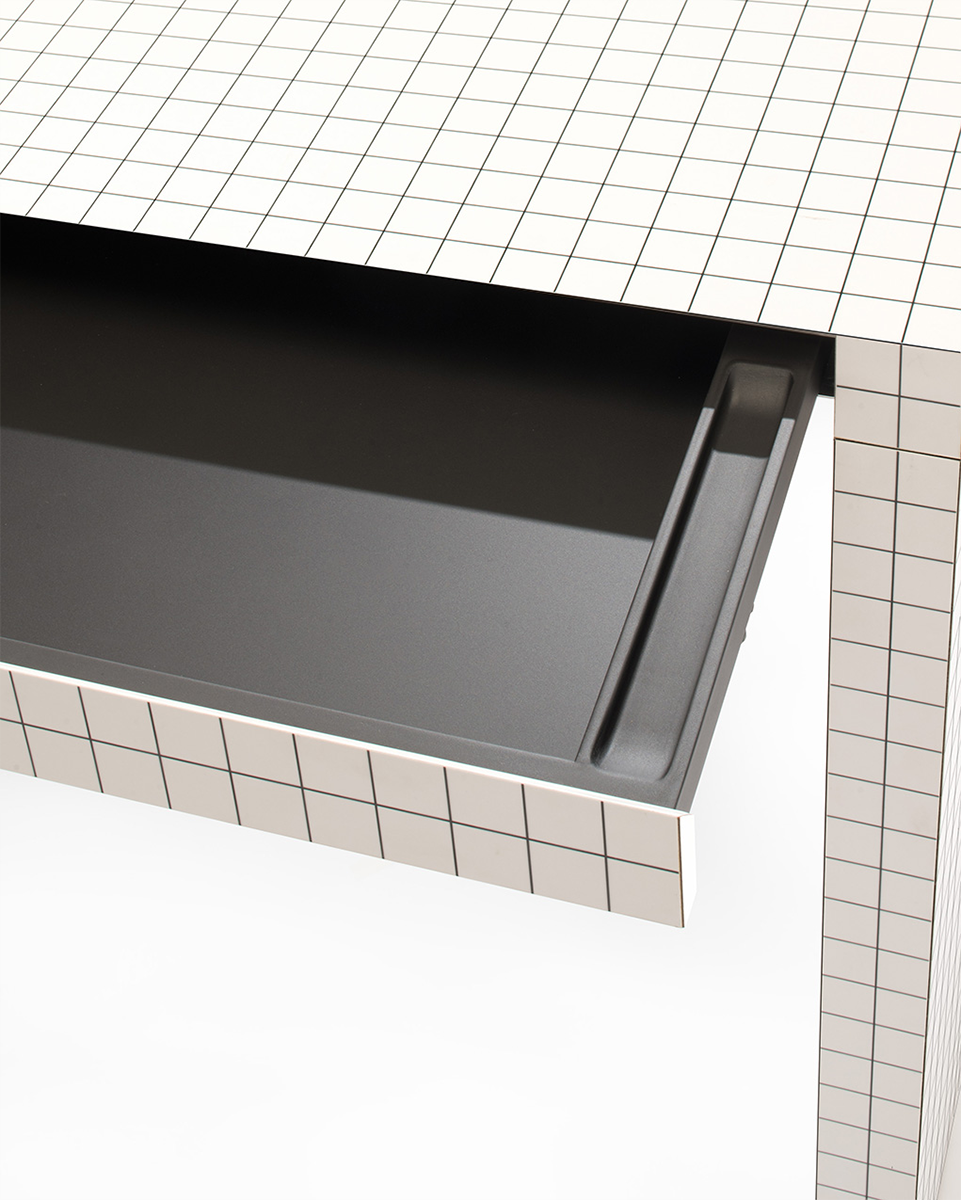 Honeycomb-konstruksjon: Lett, men robust kjerne i tre, belagt med digitalt trykt hvitt laminat og et distinkt svart rutemønster med 3 cm ruteavstand