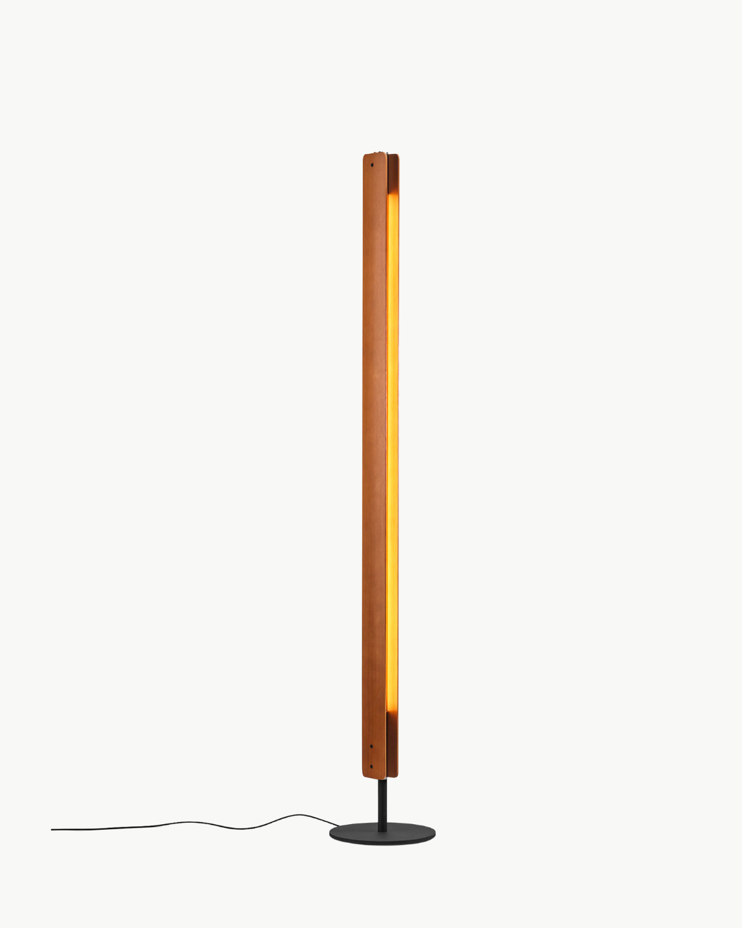 De to vertikale lamellene i ask kan roteres rundt lampens lineære LED-lyskilde, noe som lar deg kontrollere lysretningen og skape stemningsfull belysning. Basen i råsort jern sikrer stabilitet og fremhever kontrasten til de varme trelamellene. Lampen kan benyttes med både den spesialutviklede dimbare LED-kilden eller standard T8 LED-rør.