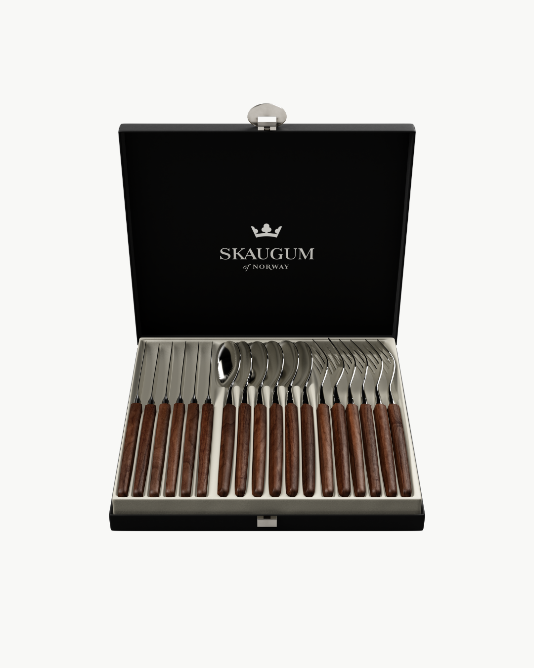 Skaugum Bestikk med Valnøtt skaft kombinerer klassisk eleganse med moderne kontraster som gir et sofistikert uttrykk til borddekkingen. Hvert bestikk håndlages i Skaugumfabrikken på Geilo.