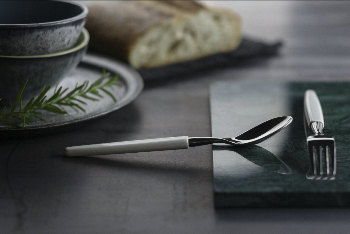 Skaugums design fra 1946 legger vekt på at bestikket både skal være godt å spise med og å holde i hånden. Det håndsmidde bestikket kommer i tre farger med plastskaft samt to versjoner med treskaft. Dette var opprinnelig i teak og palisander, men palisander ble senere erstattet med Kebony, et spesialbehandlet norsk trevirke.