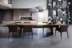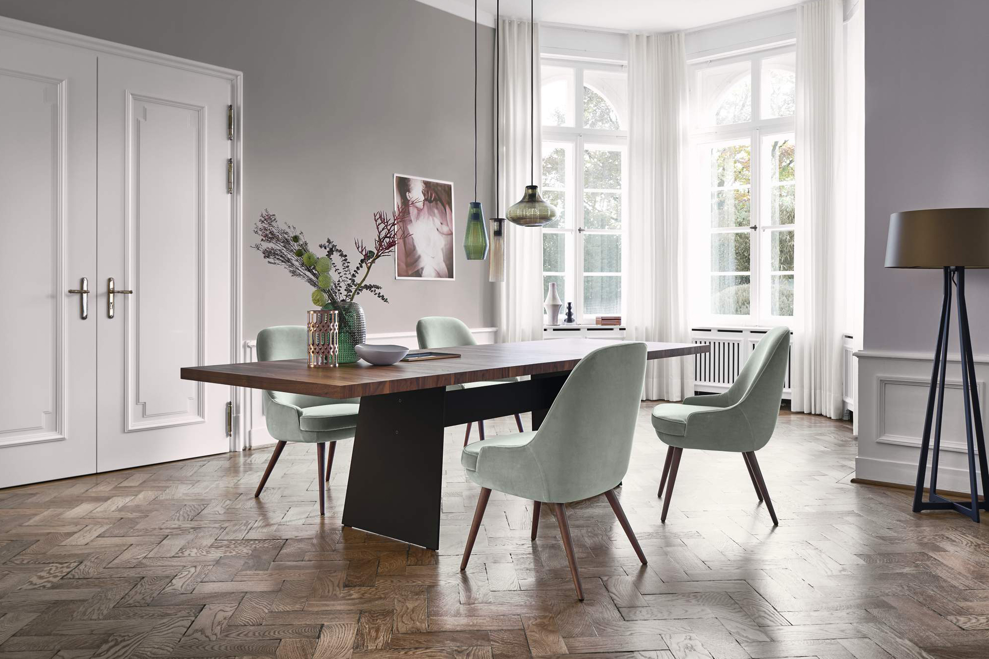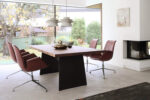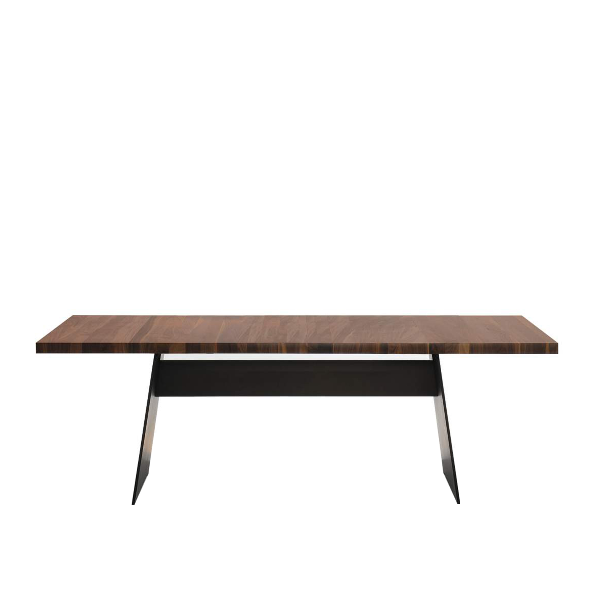 Bordplaten er laget av eik eller valnøtt, med flere overflatebehandlinger å velge mellom. Bordets understell har to paneler laget av aluminium. Tadeo-bordet kommer i en rekke størrelser og design, og kan velges med en fast bordplate eller uttrekkbar med en integrert ileggsplate. Tilpass bordet til kjøkkenet eller stuen for best resultat.