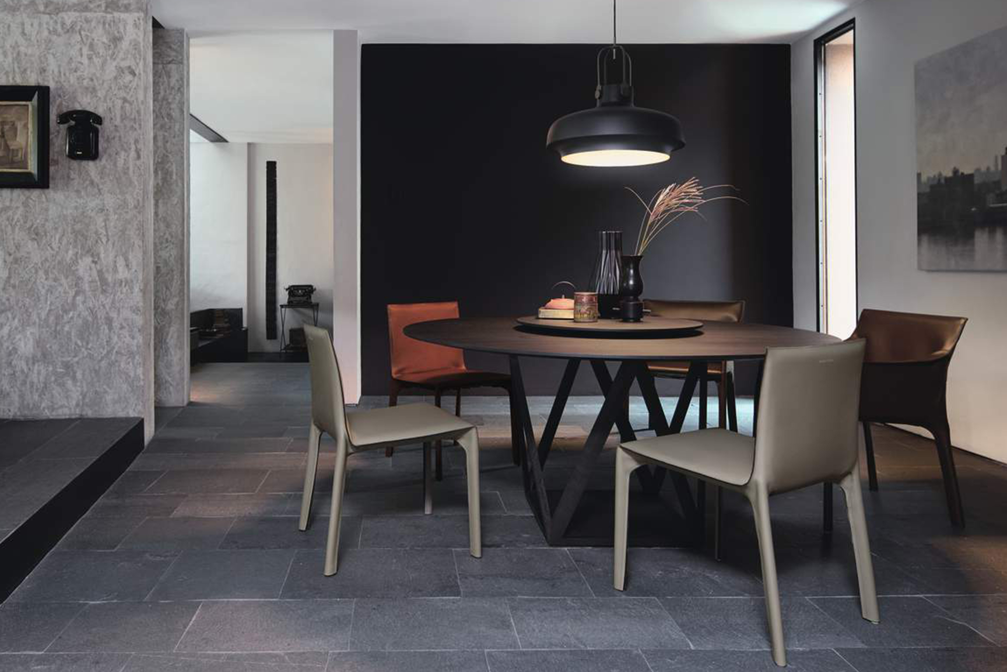 I midten av den runde bordplaten finnes det en annen rund bordplate, kalt Lazy Susan, som kan dreies denne smarte løsningen hjelper alle gjester med å nå maten. Tanken er at alle rundt bordet deler maten og dermed får en felles kulinarisk opplevelse. Tobu er laget av massivt tre med flere overflatebehandlinger å velge mellom. Det samme gjelder understellet. Lazy Susan roterer 360° og er valgbar samt avtakbar.