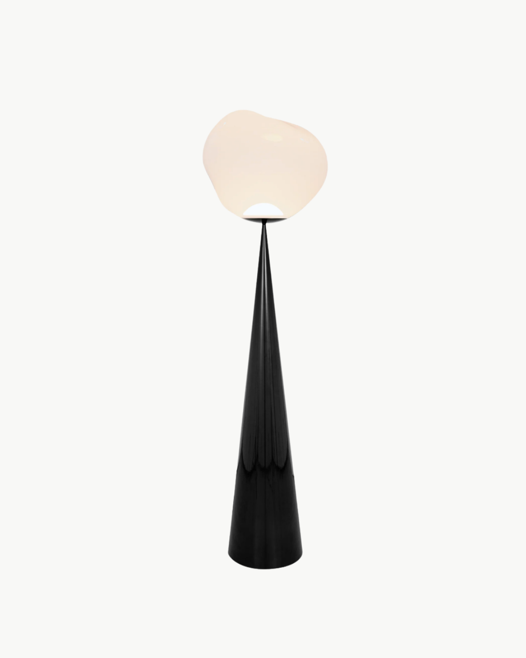 Melt Fat Floor Light i opal og svart kombinerer avansert teknologi med skulpturell design. Lampen er laget ved hjelp av blåseforming og vakuummetallisering, som skaper en smeltet kule med unikt lysuttrykk.
