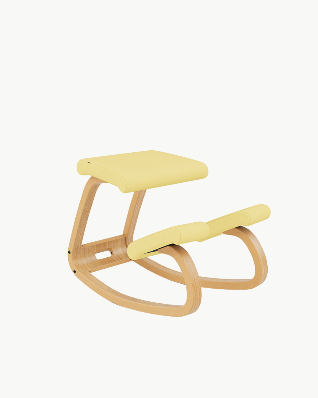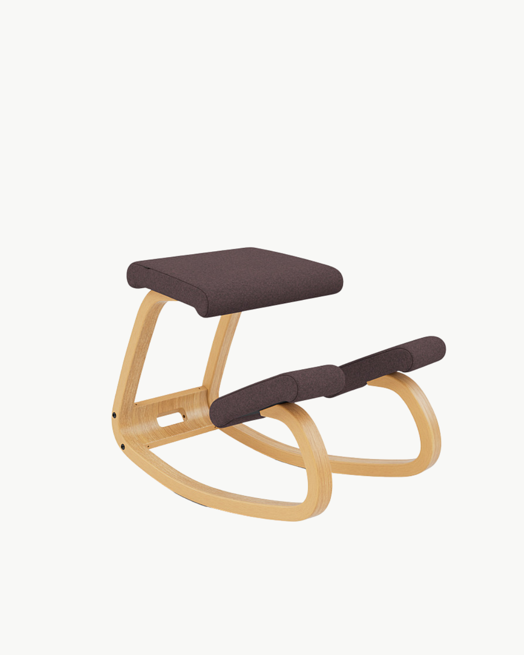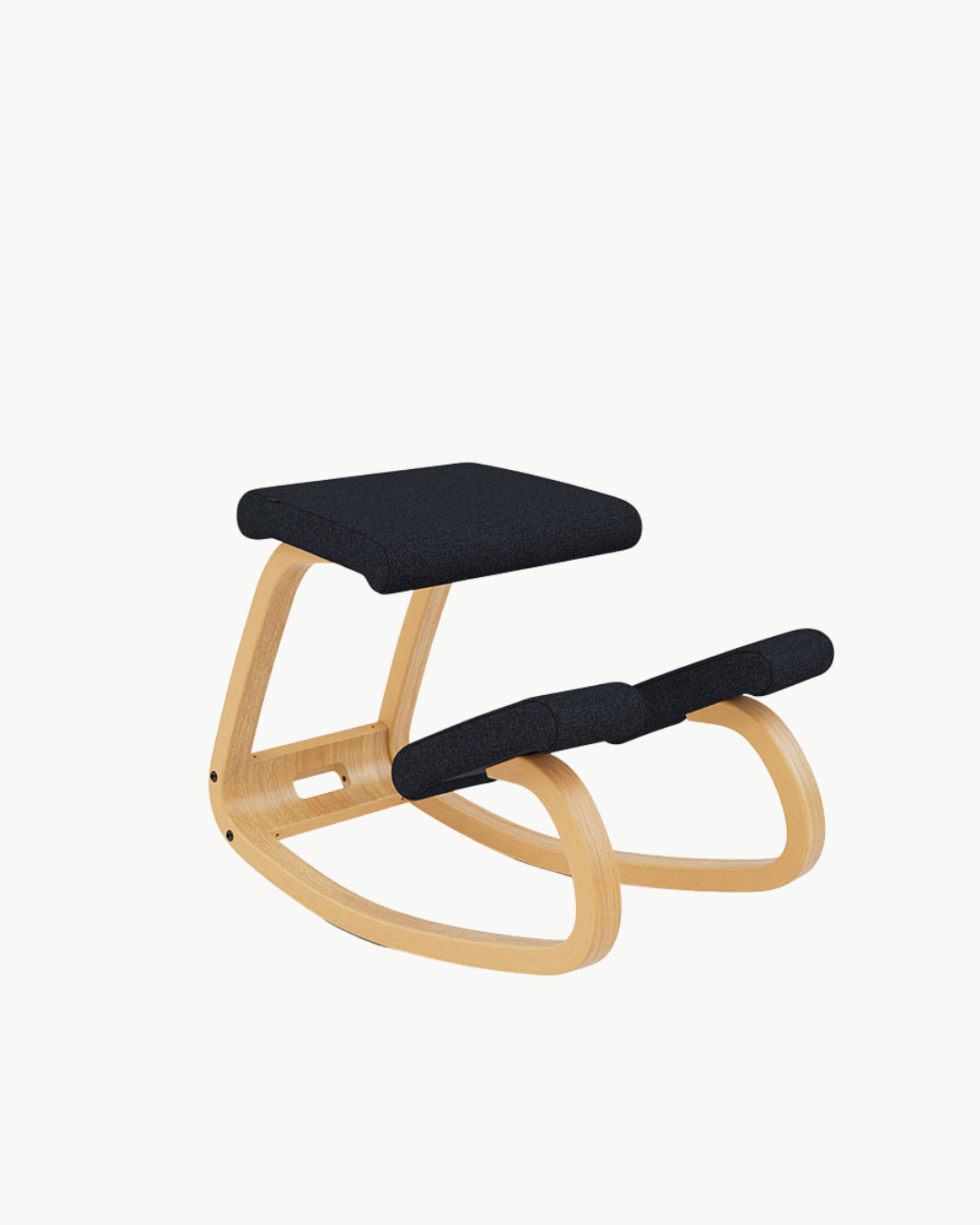 Stolens buede meier gir en myk gyngende bevegelse, mens det skrå setet åpner hoftevinkelen og fremmer en sunn, oppreist holdning. De to polstrede knestøttene under setet gir deg muligheten til å hvile begge, ett eller ingen ben – du kan like gjerne ha føttene flatt på gulvet, snu deg eller sitte sidelengs. Den åpne konstruksjonen er helt fri for mekaniske justeringer, noe som gjør stolen lett i vekt og enkel å flytte.