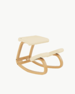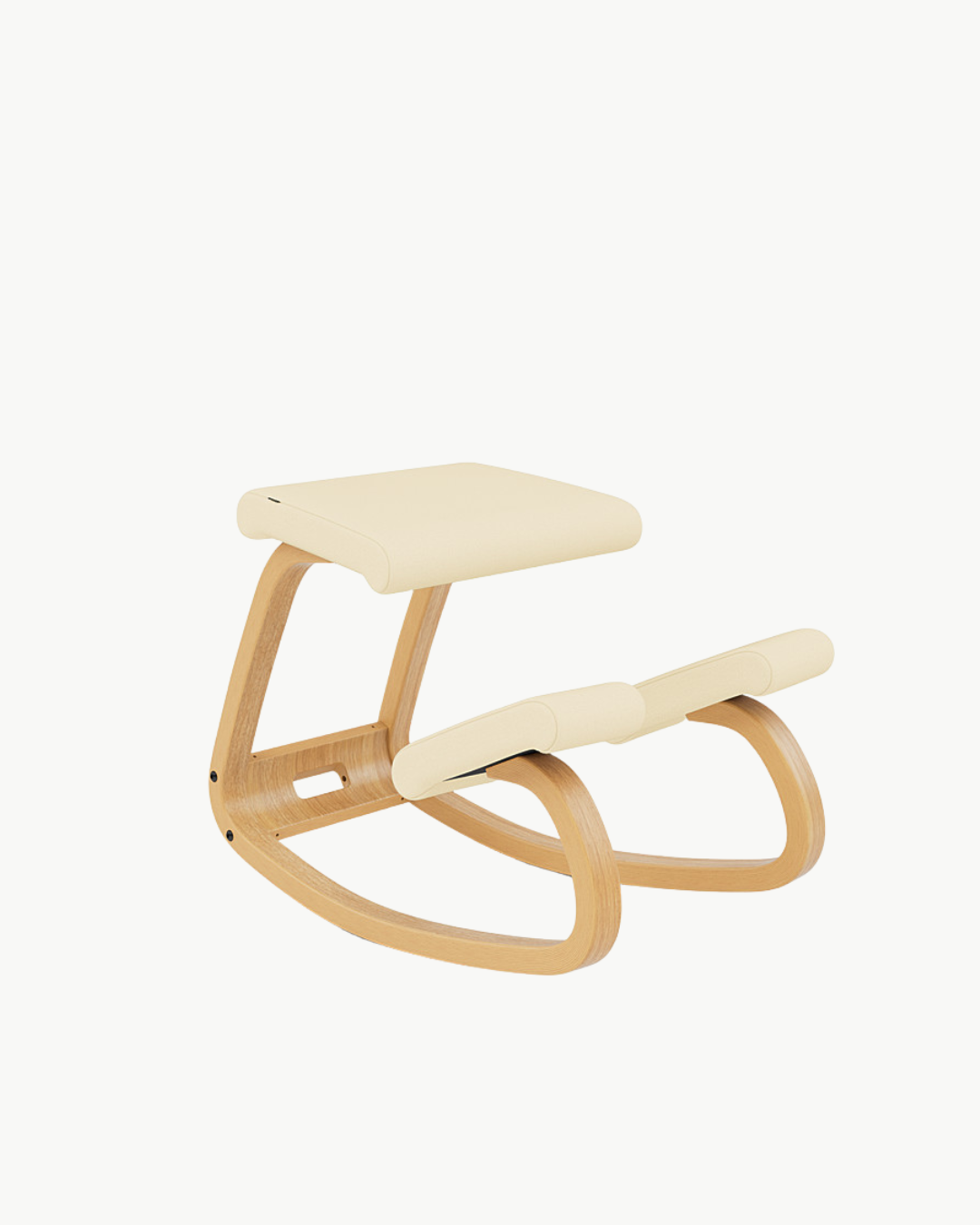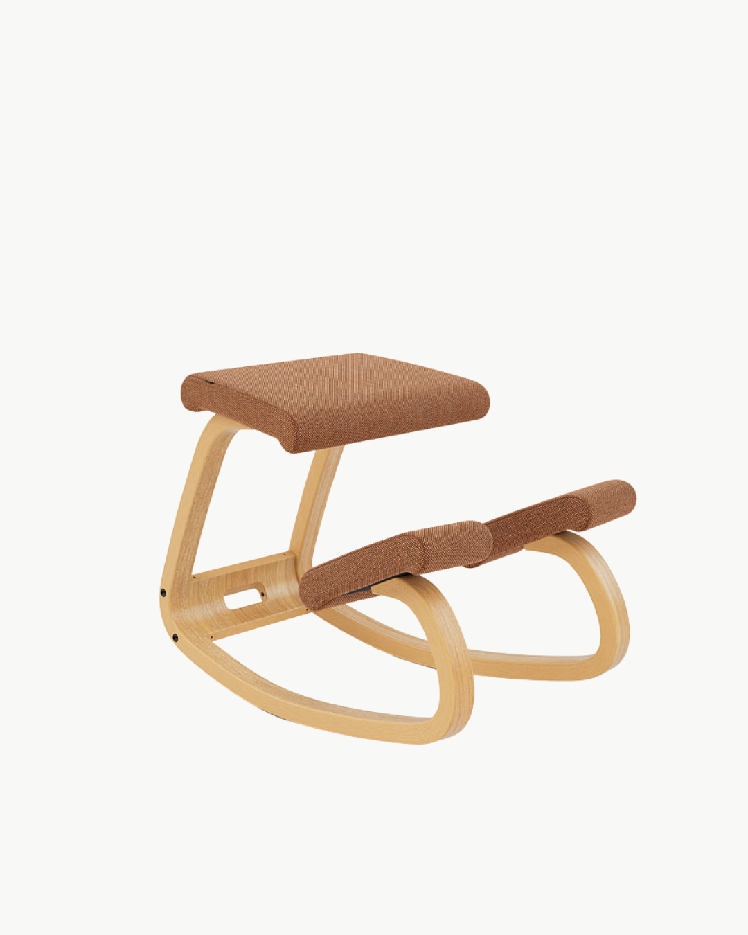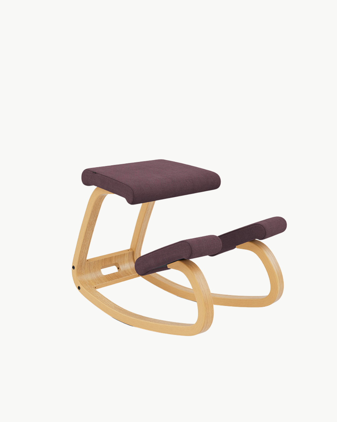 Stolens buede meier gir en myk gyngende bevegelse, mens det skrå setet åpner hoftevinkelen og fremmer en sunn, oppreist holdning. De to polstrede knestøttene under setet gir deg muligheten til å hvile begge, ett eller ingen ben – du kan like gjerne ha føttene flatt på gulvet, snu deg eller sitte sidelengs. Den åpne konstruksjonen er helt fri for mekaniske justeringer, noe som gjør stolen lett i vekt og enkel å flytte.