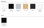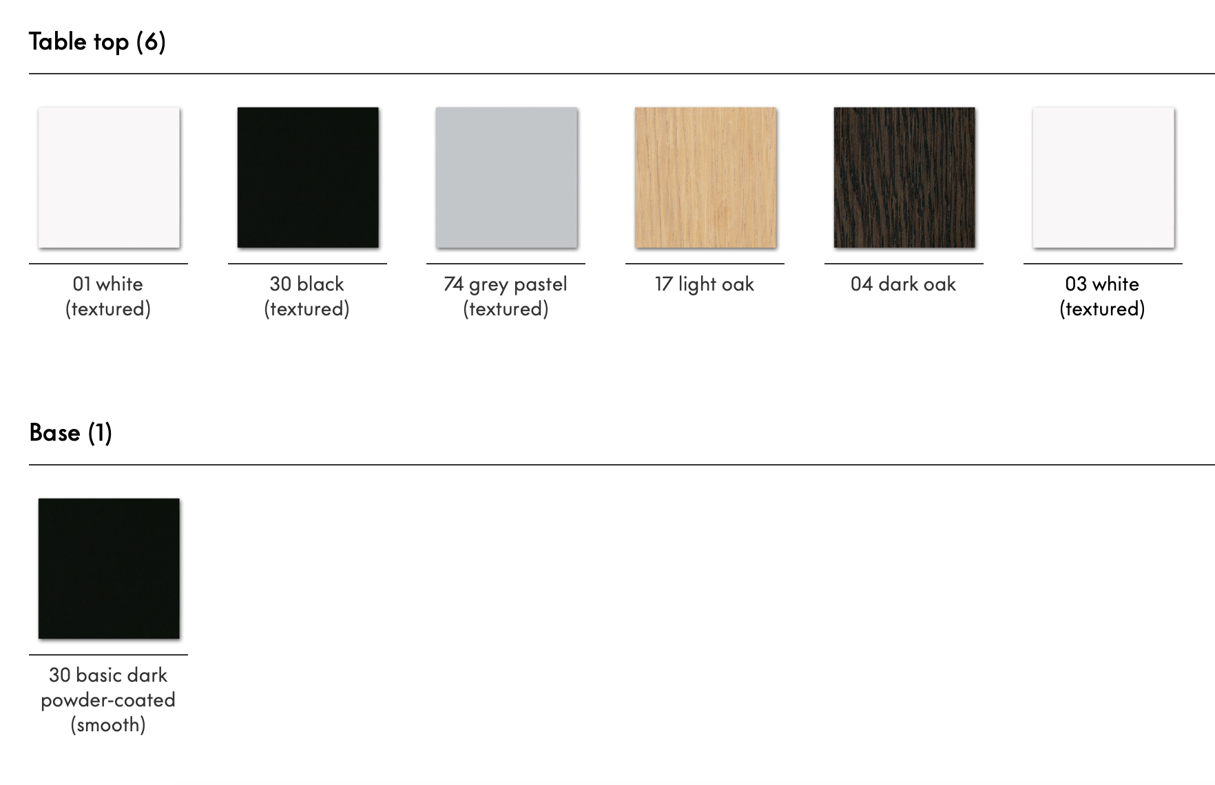 Bordplater er tilgjengelige i tre materialer: melaminvendt, hvit overflate, glatt rett plastkant (19 mm); lys eller mørk eikefiner (Europa) (19 mm); solid kjernelaminat i fargene hvit, pastellgrå eller svart med svart kant (12 mm). Den solide bordplaten i svart har et ekstra belegg mot fingeravtrykk.