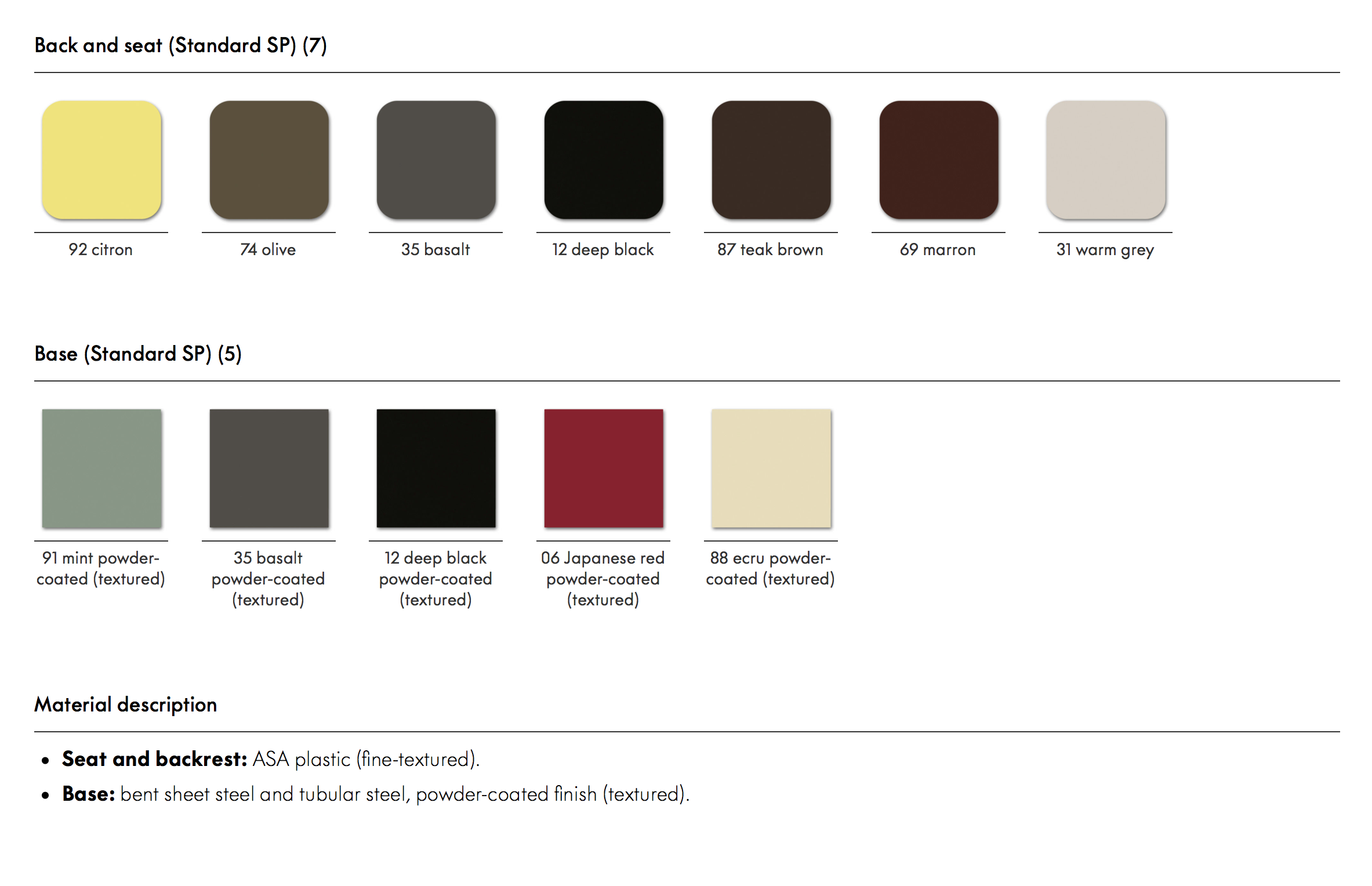Standard SP (Siège en Plastique) bygger en bro fra fortid til nåtid, og gir denne ikoniske stolen et moderne utseende uten å endre formen: laget av robust plast, seteoverflaten og ryggstøtten til Standard SP kommer i en palett med fint modulerte farger. Den slitesterke matt finishen på de pulverlakkerte basene matcher plastflatene på stolen.