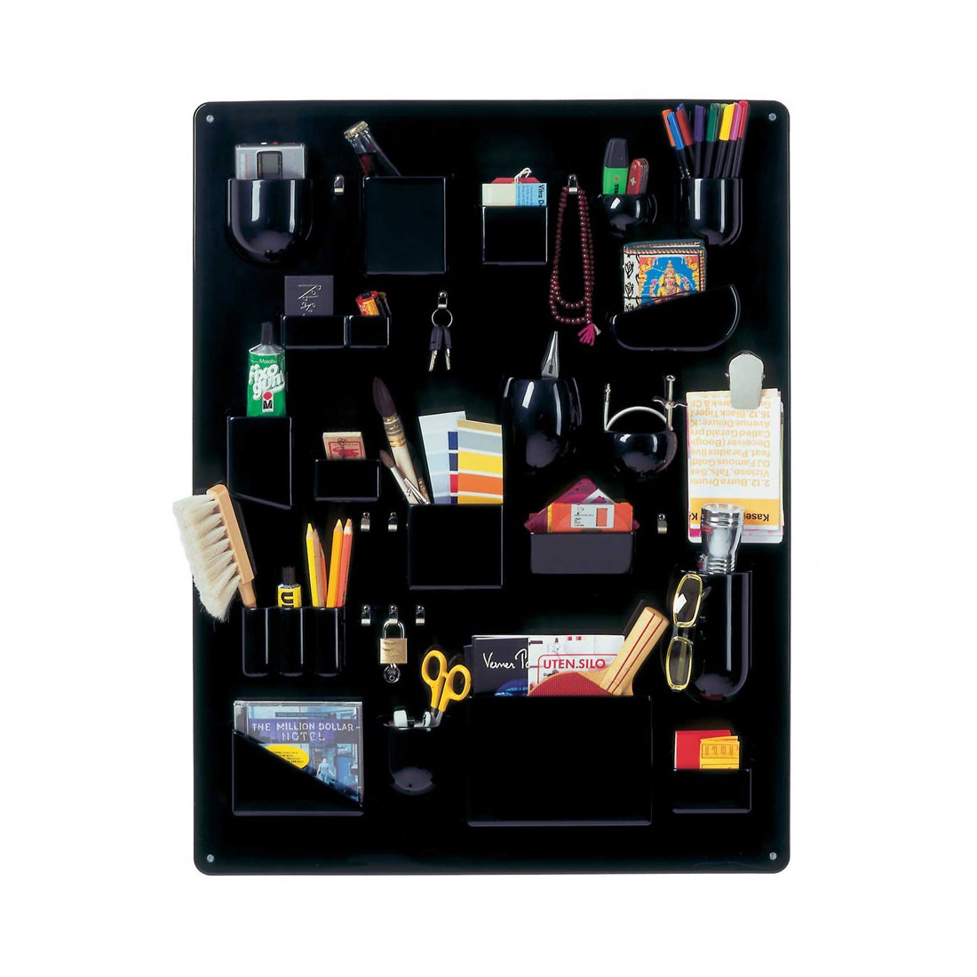 Med beholdere av forskjellige former og størrelser, metall kroker og klipp, Uten.Silo bringer orden til kontorer, kjøkken, workshops, bad og barnerom. Uten.Silo er tilgjengelig i original størrelse fra 1969 – Uten.Silo I – samt mindre 1970 -utgaven – Uten.Silo II – i fargene hvit, svart og rød .