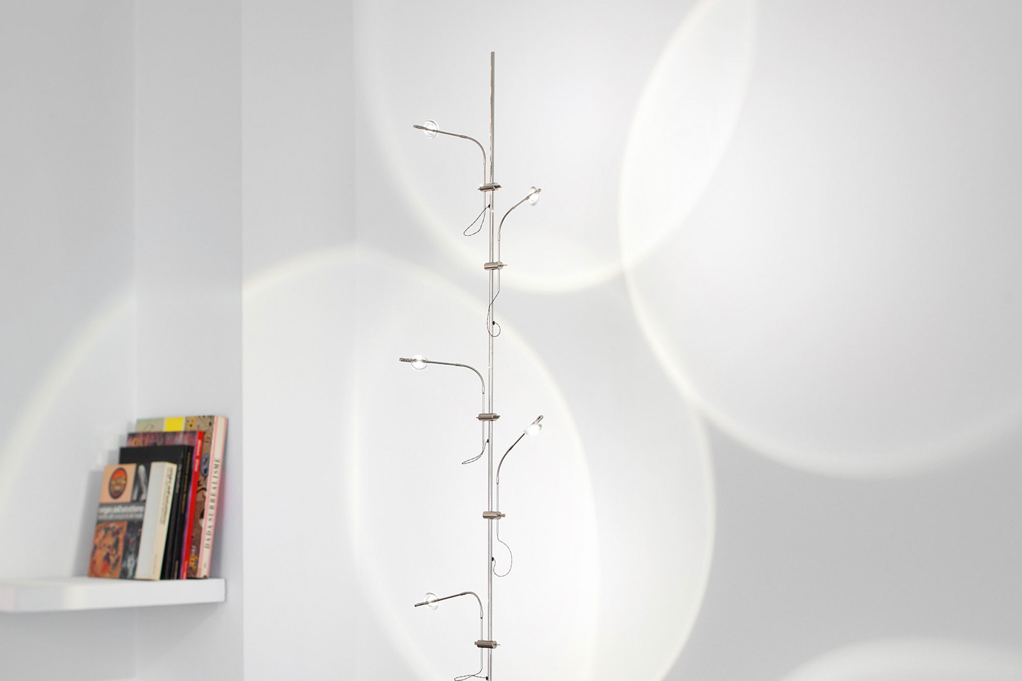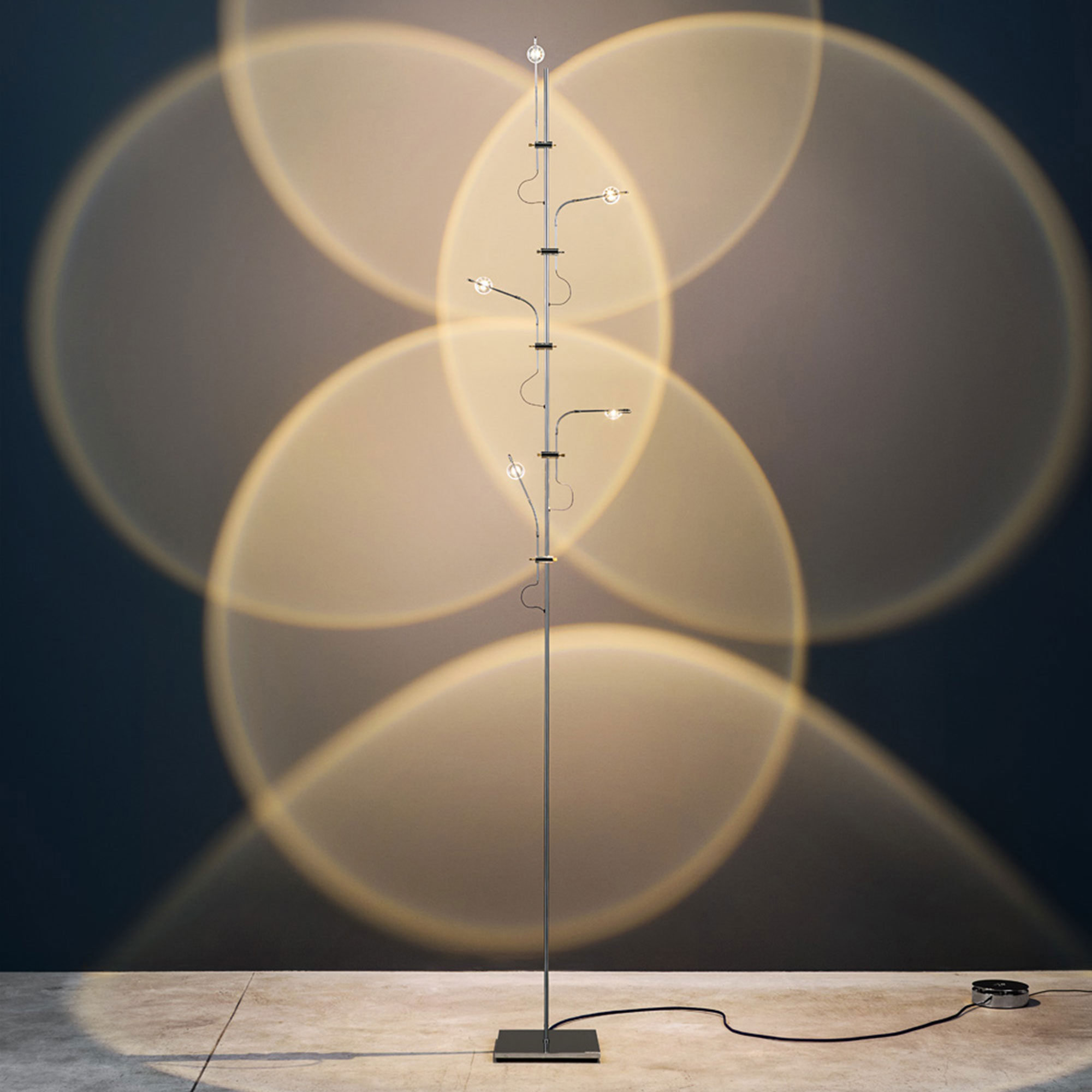Wa Wa er laget for hånd like utenfor Bergamo i Italia og består av en stilig, tynn metallstruktur i nikkel med fleksible armer i nikkelbelagt kobber. Små runde glasslinser skjuler LED-lyskildene, som gir en effektiv lysdistribusjon i rommet. Glasslinsene er avtakbare og kan dermed byttes ut om nødvendig. Lysstyrken justeres enkelt med den integrerte dimmeren ved lampens fot.
