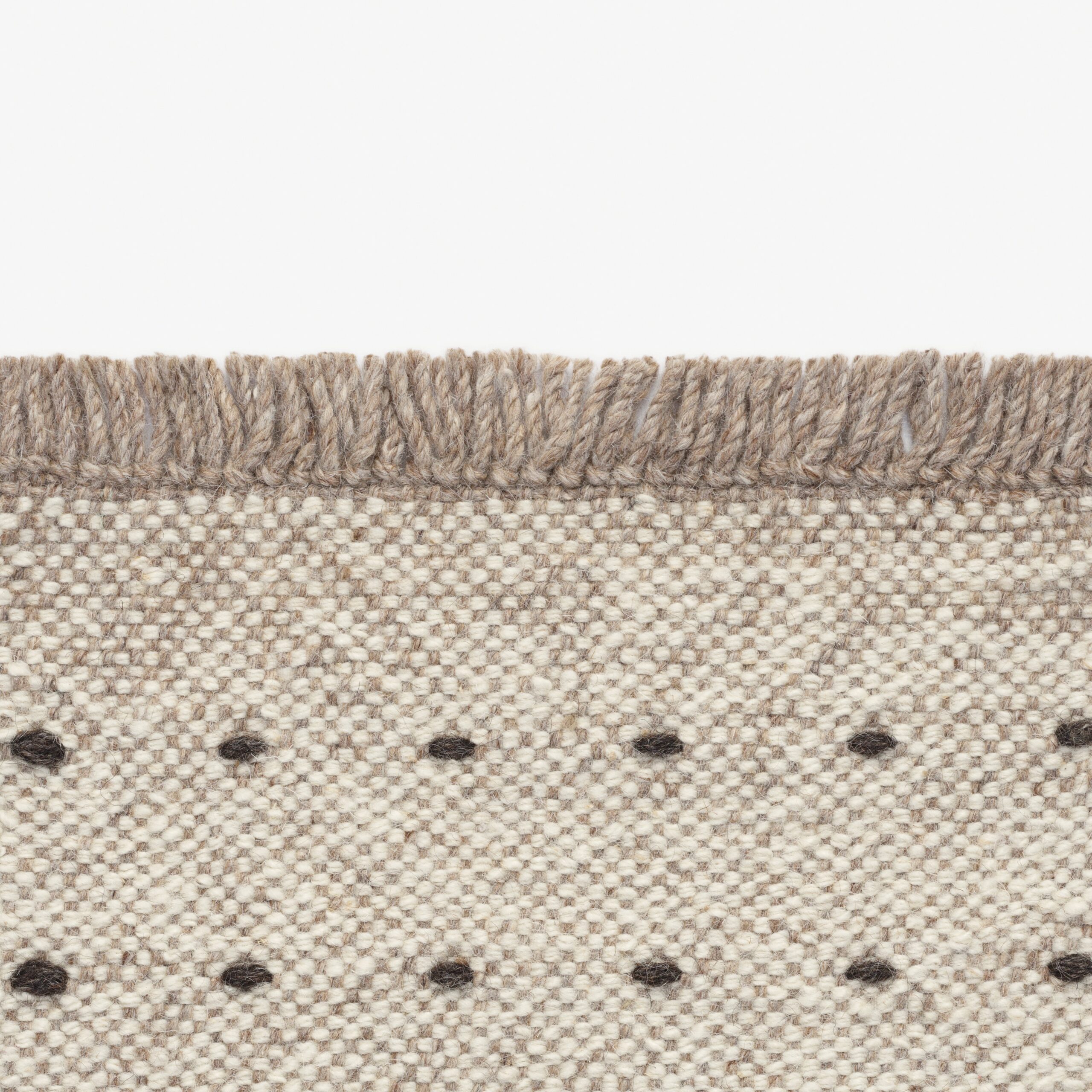 Alle fargevarianter av Yield Dot er laget utelukkende med naturlig farget ull i både renning og innslag, noe som gir teppene et levende og autentisk fargespill – helt uten kunstig farging. Ullen i renningen består av ulike naturlige nyanser, som stammer fra de naturlige fargevariasjonene i saueull. Dette kombineres med både naturlige og innfargede tråder i innslaget for å skape dybde og karakter.
